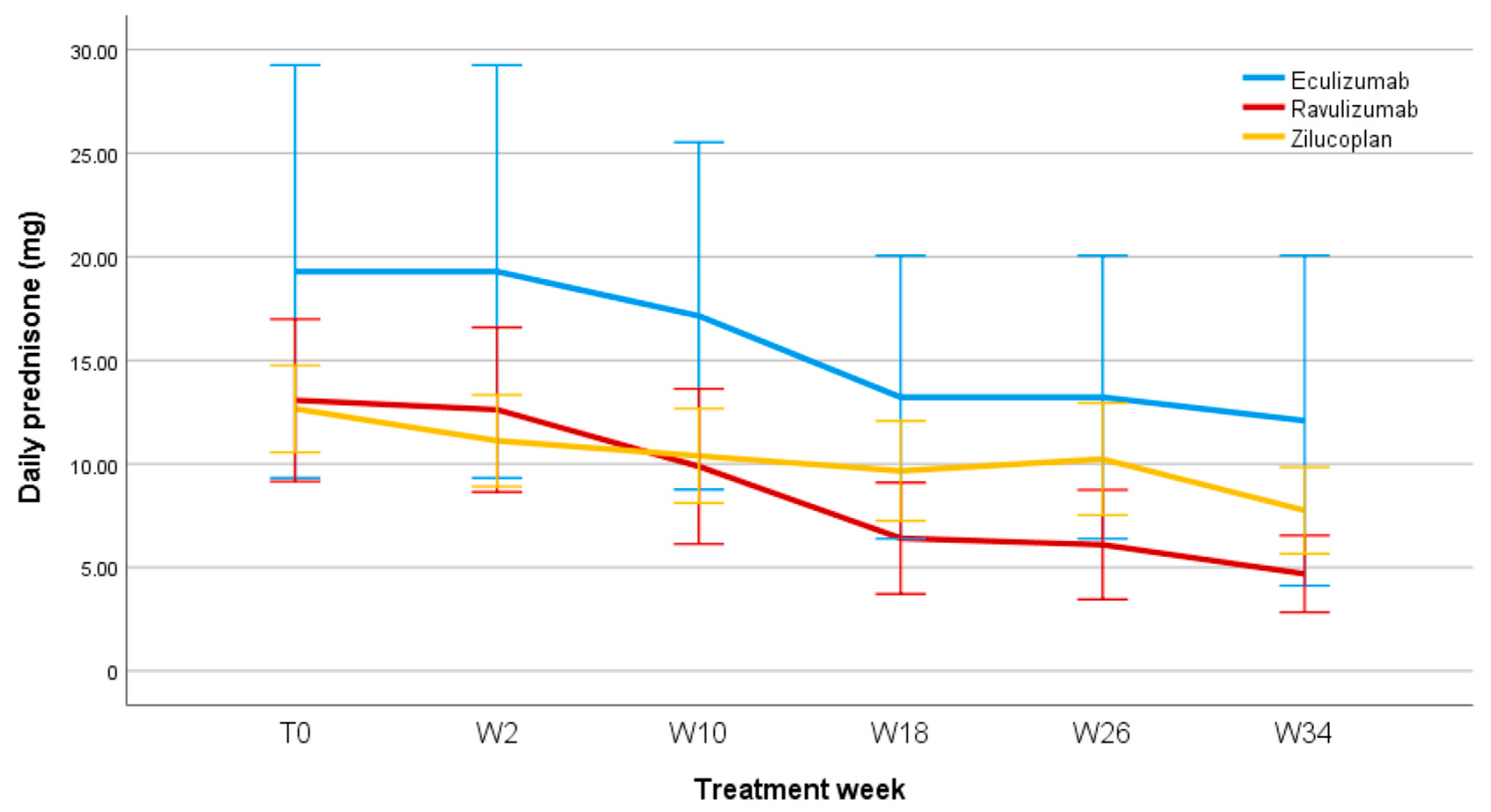 It was also possible to evaluate the steroid-sparing effect of the three C5IT, considering the baseline prednisone dosage and any changes during patients’ follow-ups. All patients included in the Eculizumab, Ravulizumab, and Zilucoplan groups underwent corticosteroid therapy before starting treatment with the respective biologics. Of these, five patients in the Eculizumab group were taking prednisone at baseline, with a mean daily prednisone dosage of 19.3 ± 26.4 mg; eight patients who started treatment with Ravulizumab were taking prednisone at baseline, with a mean daily prednisone dosage of 13 ± 13 mg; twelve patients in the Zilucoplan group were receiving daily prednisone therapy at baseline with a mean dose of 12.65 ± 7.57 mg. The graph in Figure 4 shows, for Eculizumab, Ravulizumab, and Zilucoplan, a significant reduction over time in the mean dose of prednisone taken by patients, of −37%, −62%, and −37%, respectively, at week 34 compared to baseline (we preferred, in this case, to stop our observation at week 34, as in subsequent follow-ups the number of patients receiving prednisone was too small for a comparison), with no statistically significant differences between the three groups. The mean daily dose of prednisone at week 34 was 18.13 ± 22.10 mg for patients receiving Eculizumab; 5.00 ± 5.70 mg for patients treated with Ravulizumab; and 7.92 ± 7.28 mg in patients in the Zilucoplan group. Furthermore, regarding Eculizumab, of the five patients who were taking prednisone at baseline, one of them discontinued prednisone therapy; one patient treated with Ravulizumab discontinued prednisone therapy during follow-up; two patients in the Zilucoplan group discontinued prednisone.
