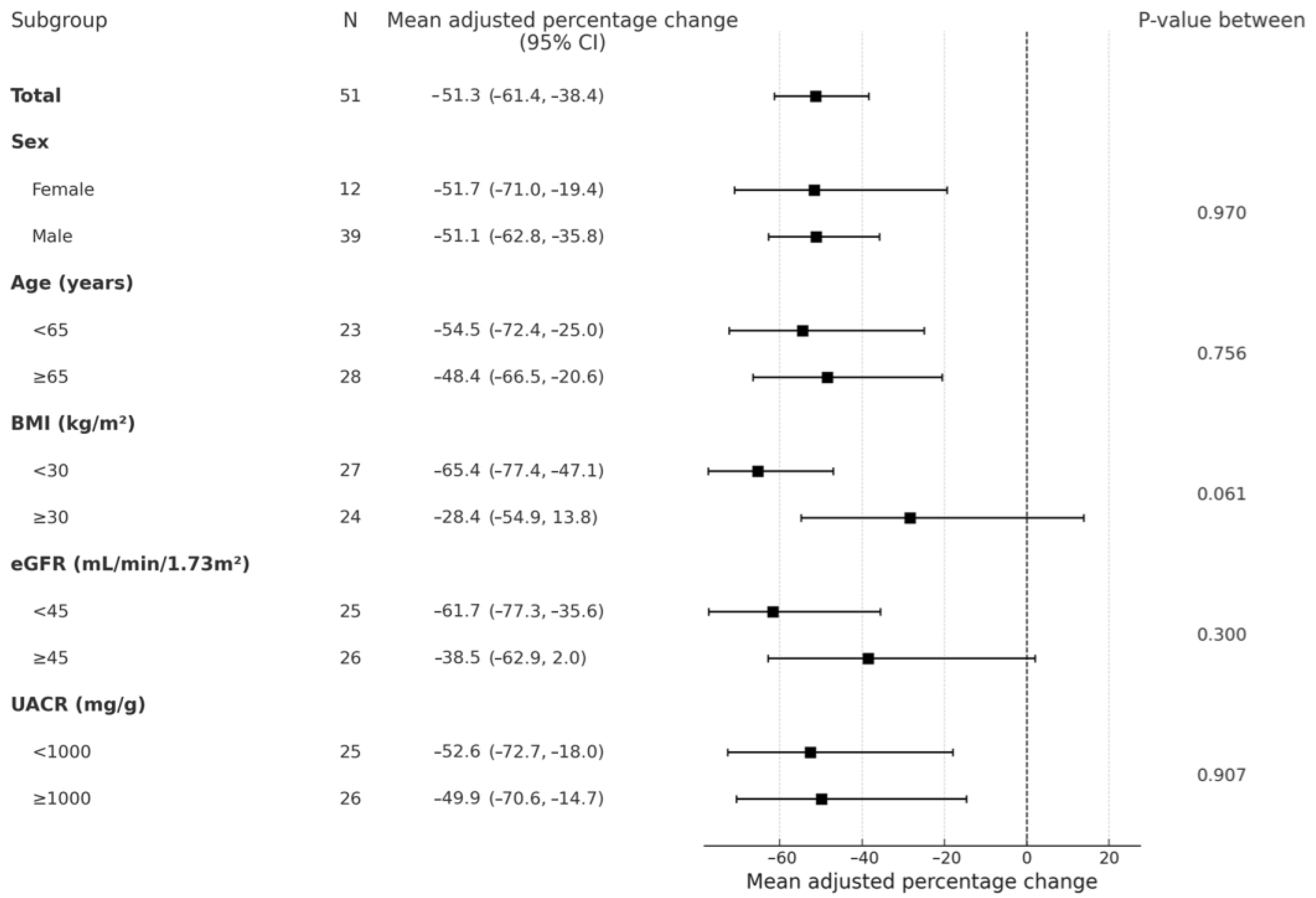 | UACR † (log-transformed) | LS mean ratio | 0.487 | 0.386, 0.616 | <0.001 |