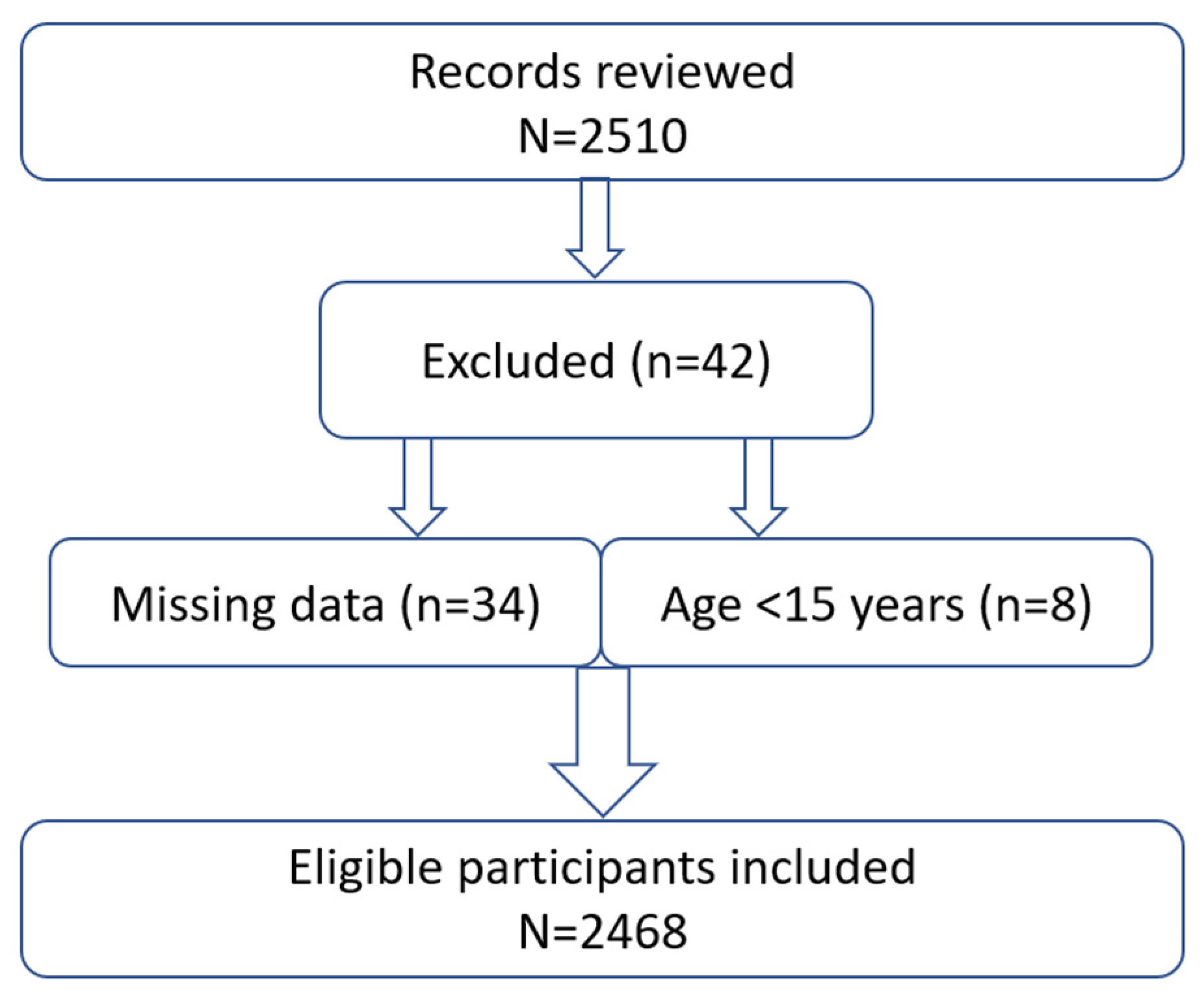 We included all patients aged ≥18 years who had a documented fasting lipid profile and relevant clinical data in the source records during the study period. A total of N = 2468 participants met these criteria and were included in the final analysis. Figure 1 illustrates the inclusion process. Patients below 18 years of age or those lacking essential data (such as absence of any lipid measurement) were excluded; however, due to the comprehensive data retrieval efforts, missing data were minimal. To ensure transparency and reproducibility, we examined the extent of missing data across all study variables. Less than 5% of values were missing for any covariate or outcome, and missingness appeared to be unrelated to FH status or cardiovascular outcomes. In line with recommendations stating that complete case analysis is appropriate when the proportion of missing data is very minimal and unlikely to introduce systematic bias, our primary analyses were limited to participants with complete data. The sample comprised individuals from both urban and rural clinics in Kazakhstan, with diverse ethnic backgrounds (e.g., Kazakh, Russian, and other ethnicities represented). Basic demographic information (age, sex, ethnicity), clinical history, and laboratory results were collected from the records at baseline.