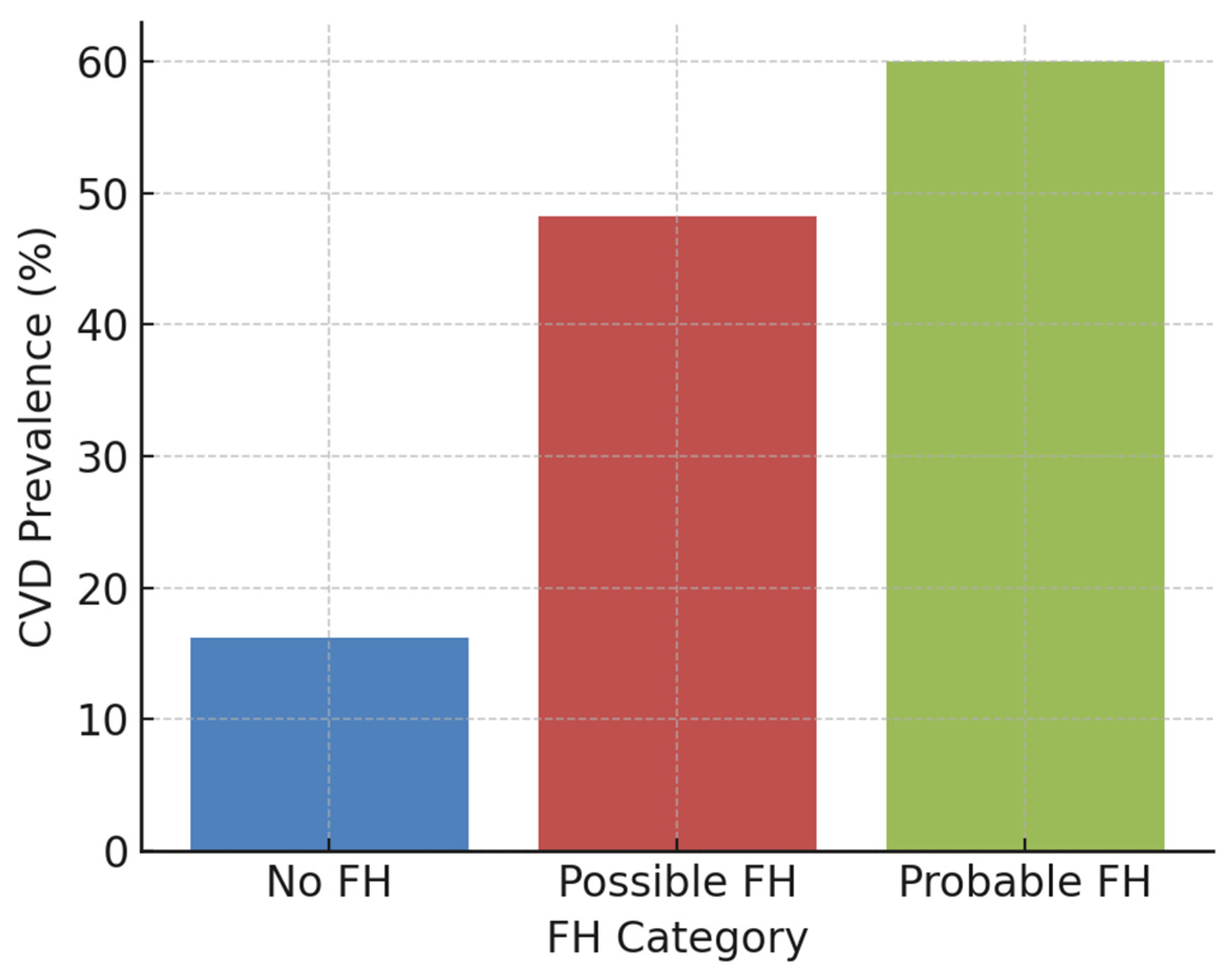 Figure 2 shows the CVD prevalence across FH categories. Notably, nearly two-thirds of the probable FH group had experienced a cardiovascular event.