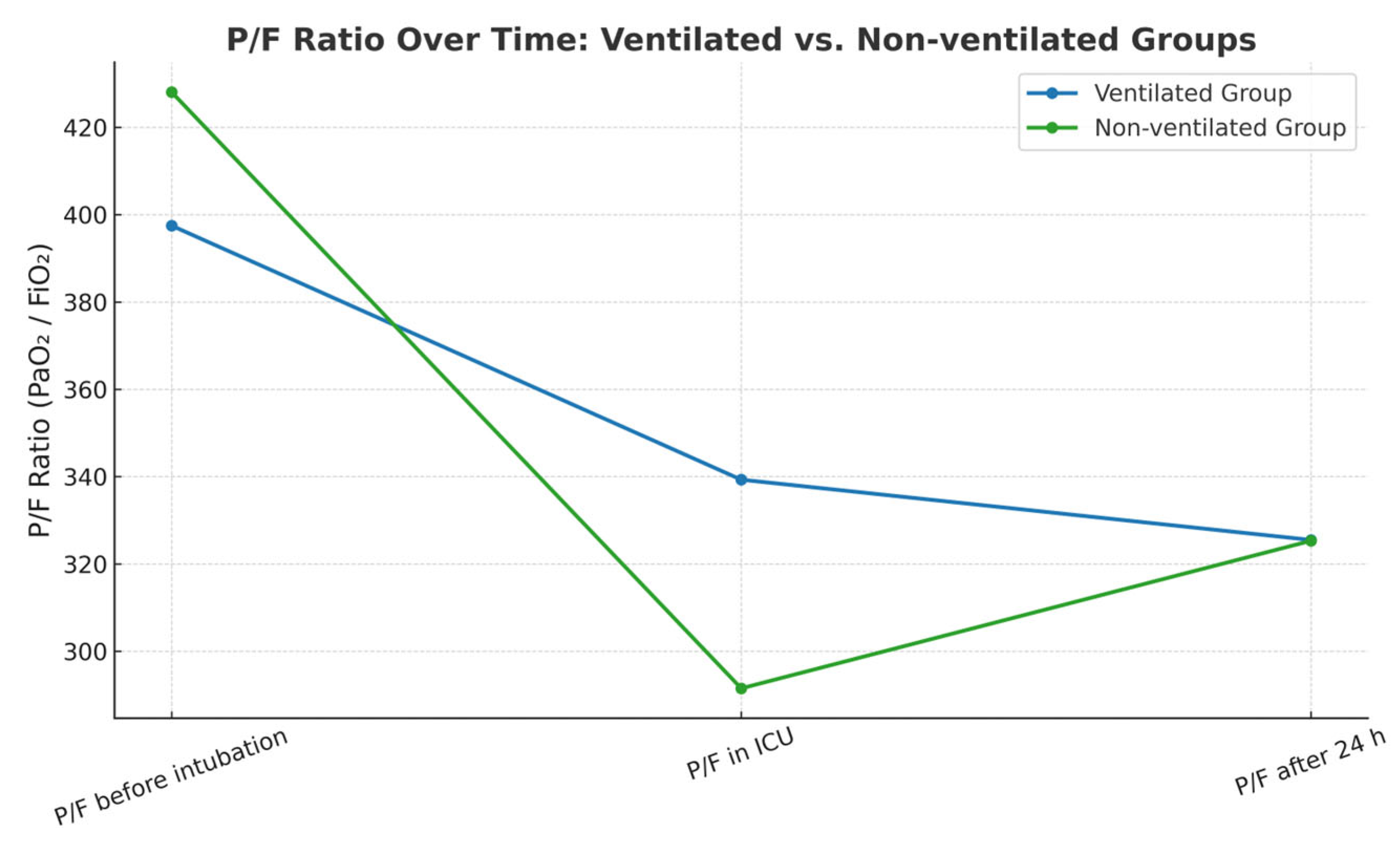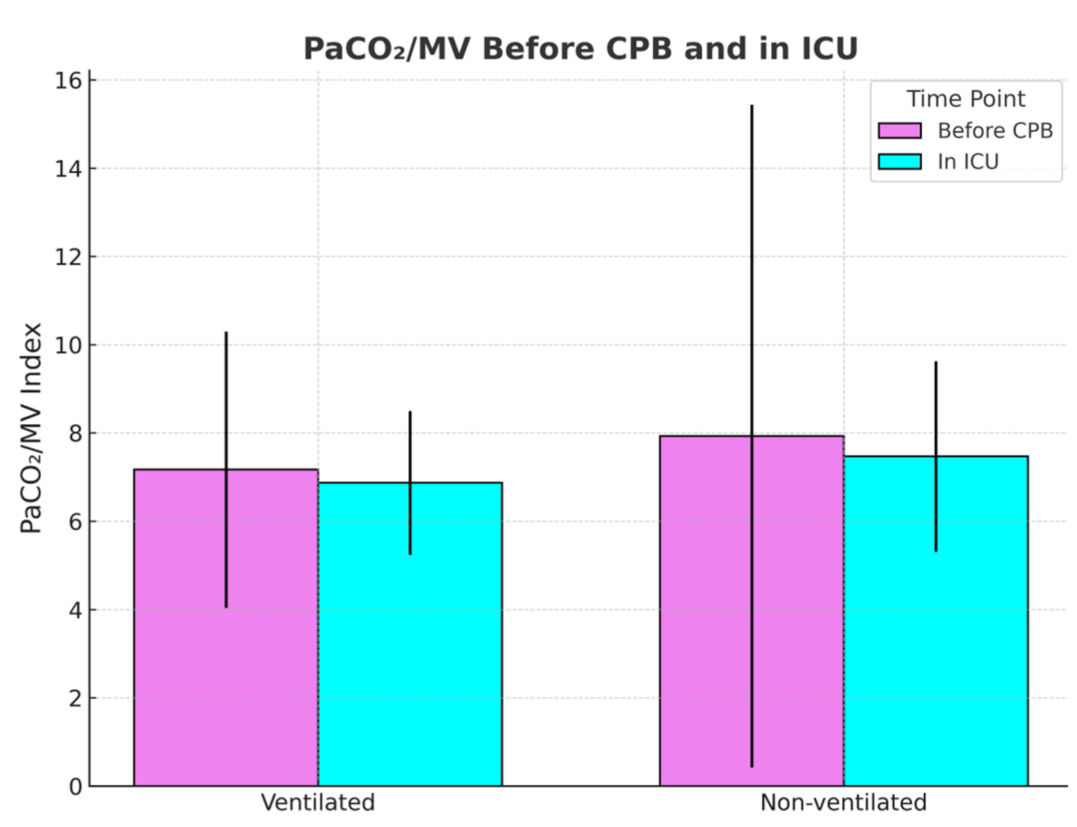 Primary and secondary outcomes were pre-specified before data collection. The primary outcome of the study was the comparison of the P/F (PaO2/FiO2) ratio between the ventilated and non-ventilated groups. Secondary outcomes included the assessment of PaCO2, PaO2, the PaCO2/MV (PaCO2/minute ventilation, mmHg/L/min) index, X-ray findings, ICU stay, mortality, reintubation, re-exploration, and bleeding. The PaCO2/MV index is a surrogate for ventilatory efficiency and dynamically assesses how effectively the lungs eliminate CO2 per unit of ventilation. A sample size assessment was performed assuming a moderate effect size (Cohen’s d = 0.4) for the difference in the primary outcome parameters, a two-sided α = 0.05, and power = 0.80.