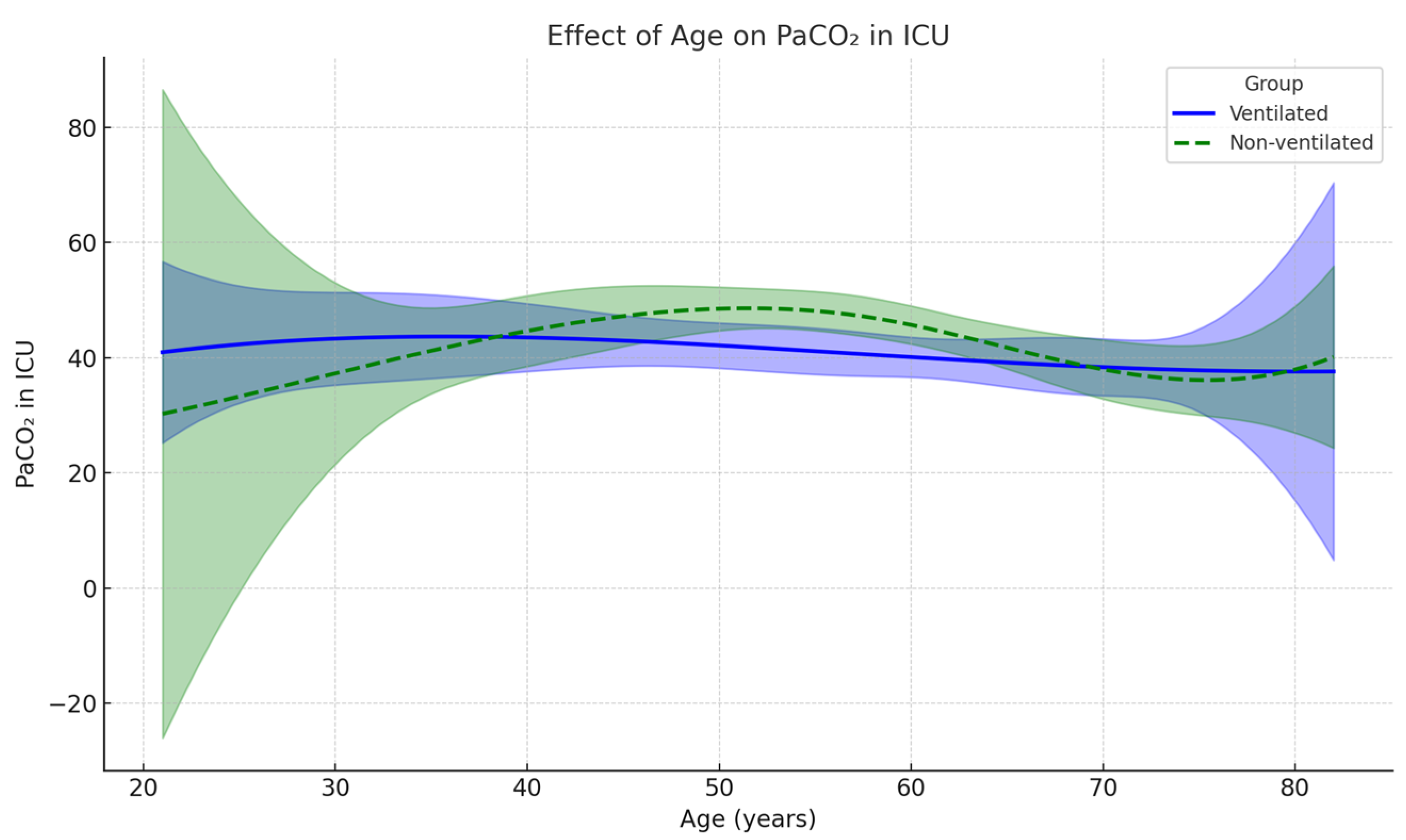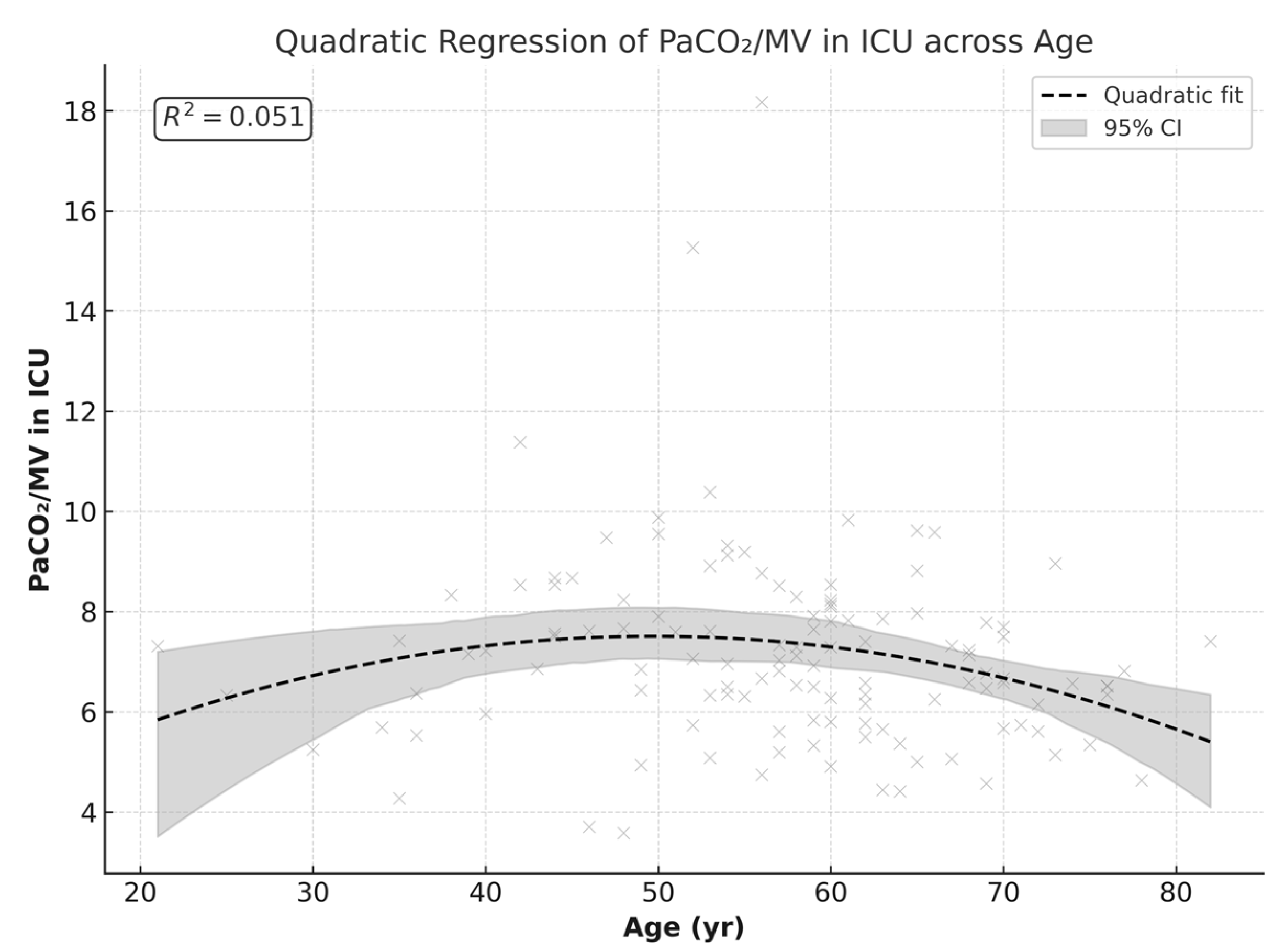 p = 0.059). Quadratic regression analysis revealed an age-dependent U-shaped relationship, with PaCO