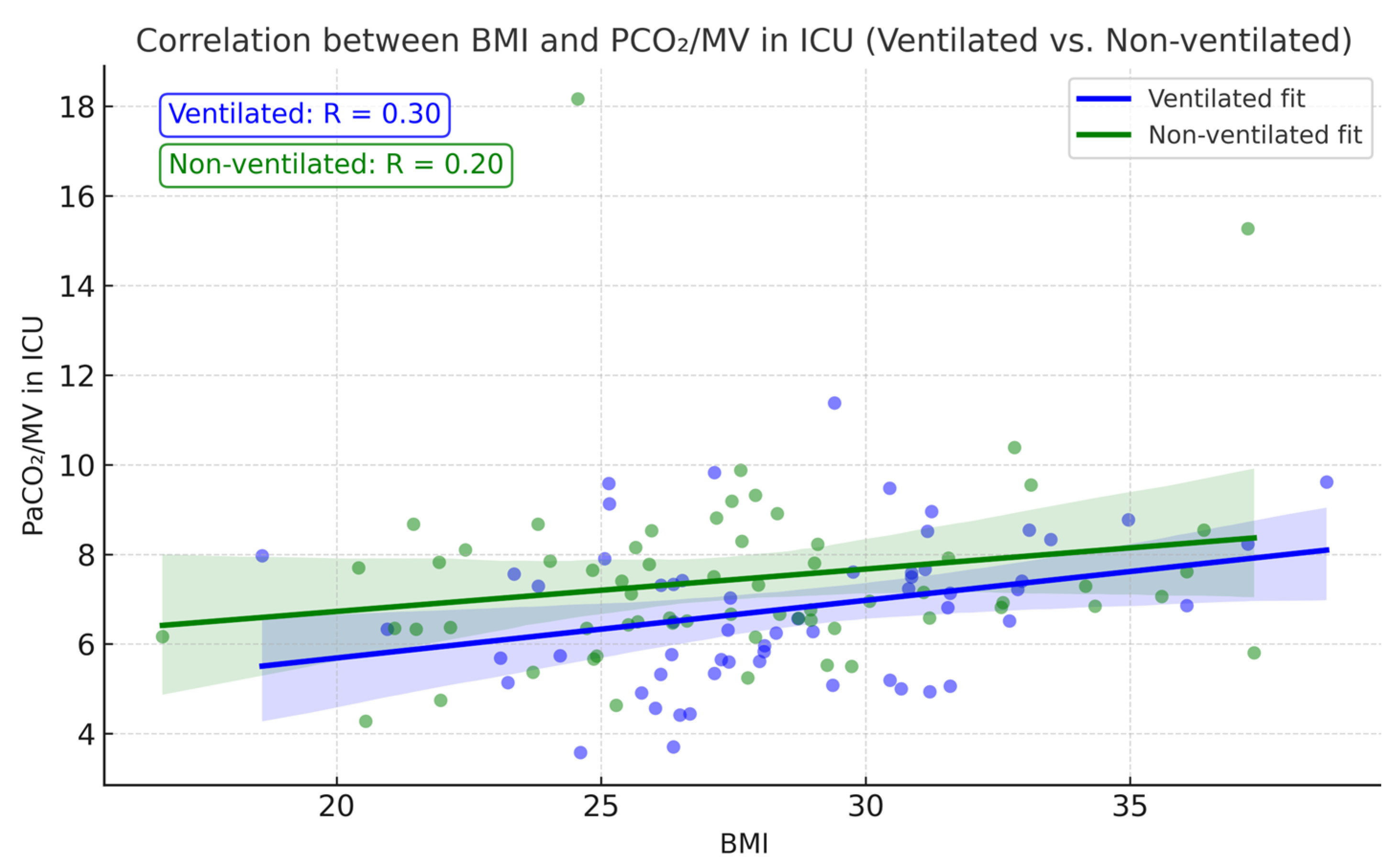 p = 0.68). In the non-ventilated group, mechanical ventilation time showed a weak and possibly borderline significant association with PaCO