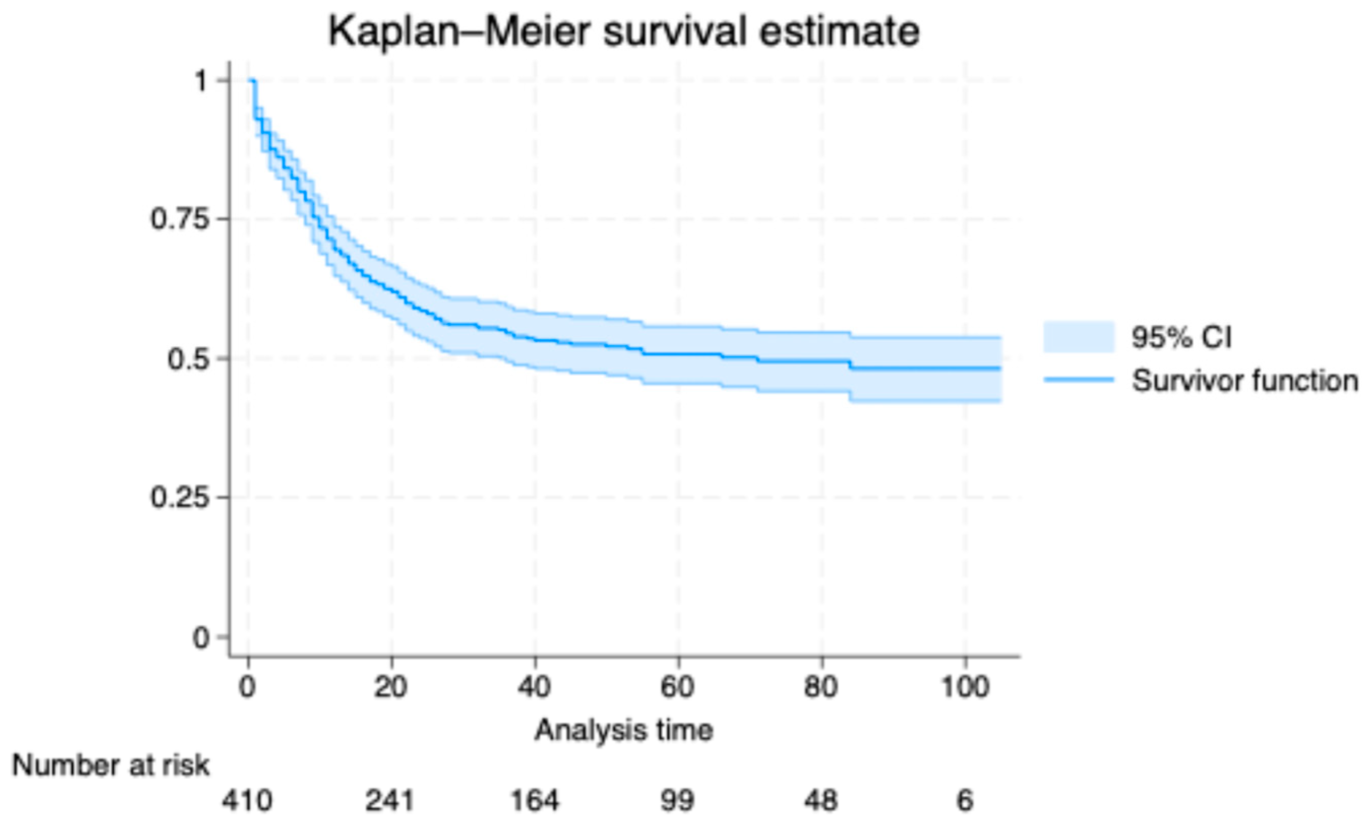 Figure 1). The median survival time was 20 months. Numbers at risk decreased from 410 at baseline to 241, 164, 99, 48, and 6 at 20, 40, 60, 80, and 100 months, respectively.