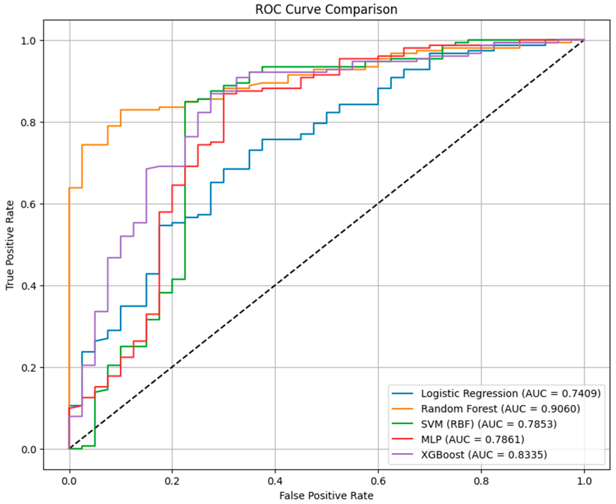 The SVM-RBF model produced an AUC of 0.7853, an accuracy of 0.839, and an F1 of 0.908, but was characterized by a high false-positive rate. On the other hand, the logistic regression model demonstrated the lowest AUC (0.7409) and specificity (0.28), but preserved high sensitivity (0.967) and an F1-score of 0.896, with an overall accuracy of 0.823.