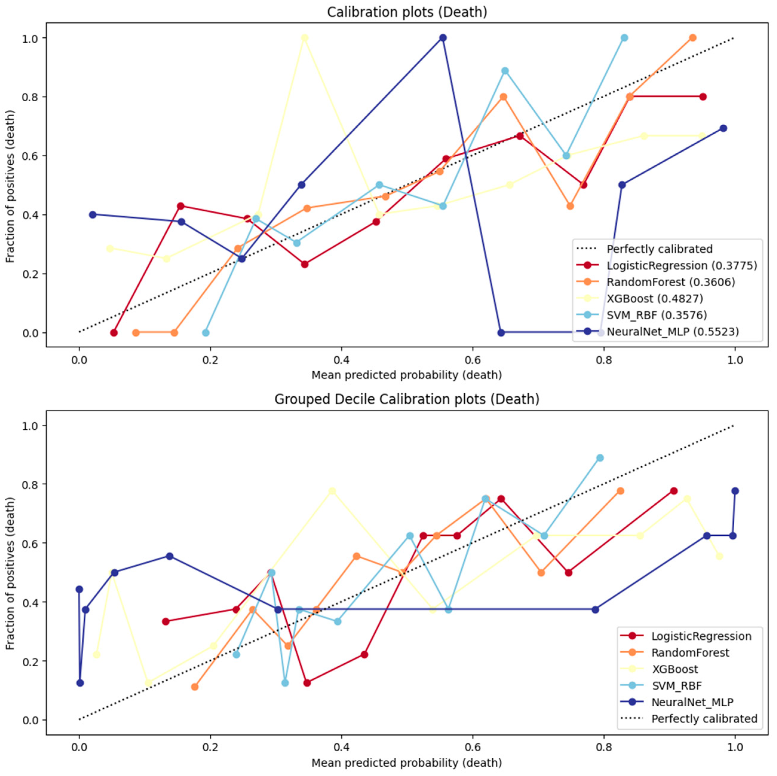The SVM-RBF model achieved a comparable Brier score (0.357), but showed greater fluctuation across risk intervals. XGBoost demonstrated moderate calibration (Brier = 0.482), with a tendency to overpredict mortality in intermediate-risk patients. In contrast, the MLP neural network displayed the highest prediction error (Brier score = 0.552) and inconsistent calibration, reflected by marked deviations from the reference line in both detailed and decile-grouped calibration curves.