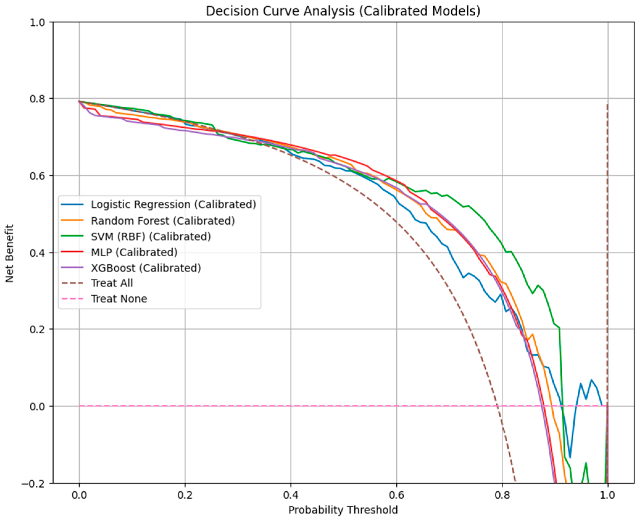 Figure 5) further contextualized these findings in terms of clinical net benefit. All machine learning classifiers outperformed the “treat-all” and “treat-none” strategies across relevant threshold probabilities. The DCA threshold ranged between 0.10 and 0.60.