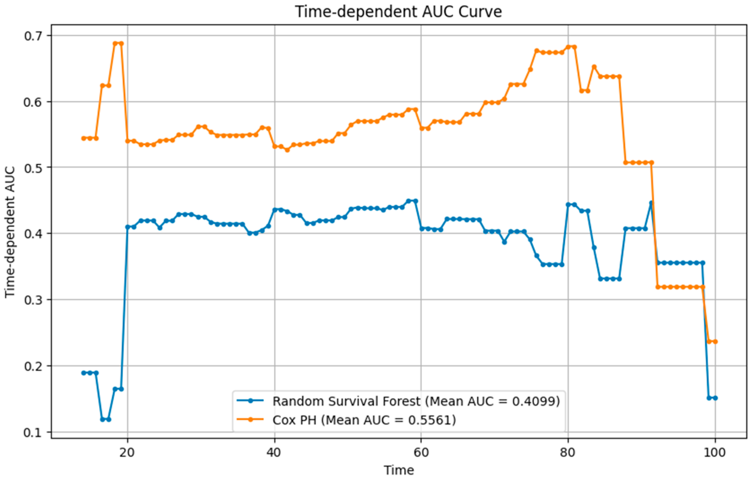 Figure 6) showed that Cox PH maintained moderate but stable discrimination over time, while RSF exhibited early instability and overall lower performance.