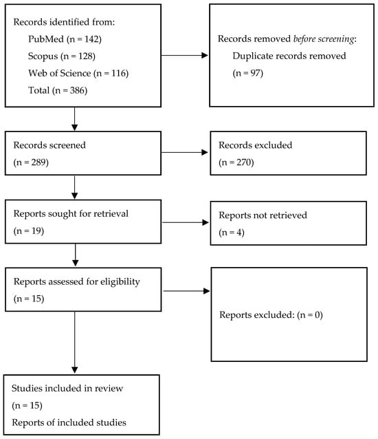 Initial literature screening yielded 386 records. After removal of 97 duplicates, 289 studies remained for title and abstract screening. A total of 270 studies were excluded because they did not meet the predefined eligibility criteria.
