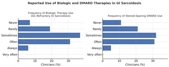 Reported use of biologic and steroid-sparing DMARD therapies in GI sarcoidosis. Bars indicate the percentage of clinicians reporting each frequency of use for biologics (left) and DMARDs (right) (N = 132). Abbreviations: DMARD, disease-modifying anti-rheumatic drugs; GI, gastrointestinal.
