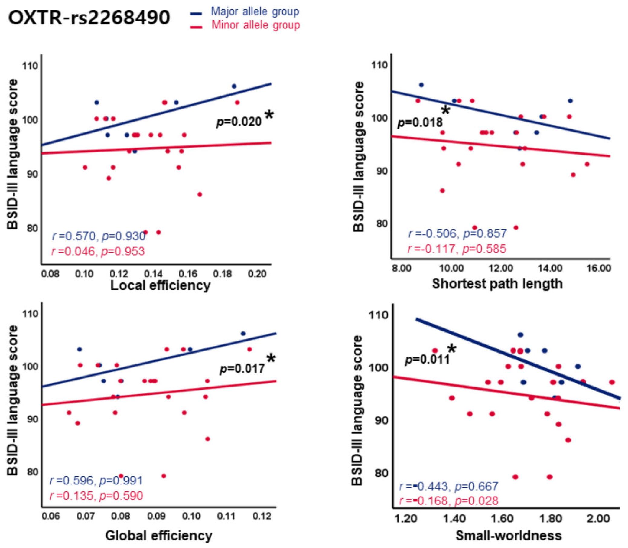 | OXTR | rs2268490 | −0.145 (−0.254 to −0.035) | 0.012 | 0.011 (−0.016 to 0.004) | 0.038 | 0.018 (0.001 to 0.034) | 0.042 | −1.912 (−3.331 to 0.512) | 0.010 |