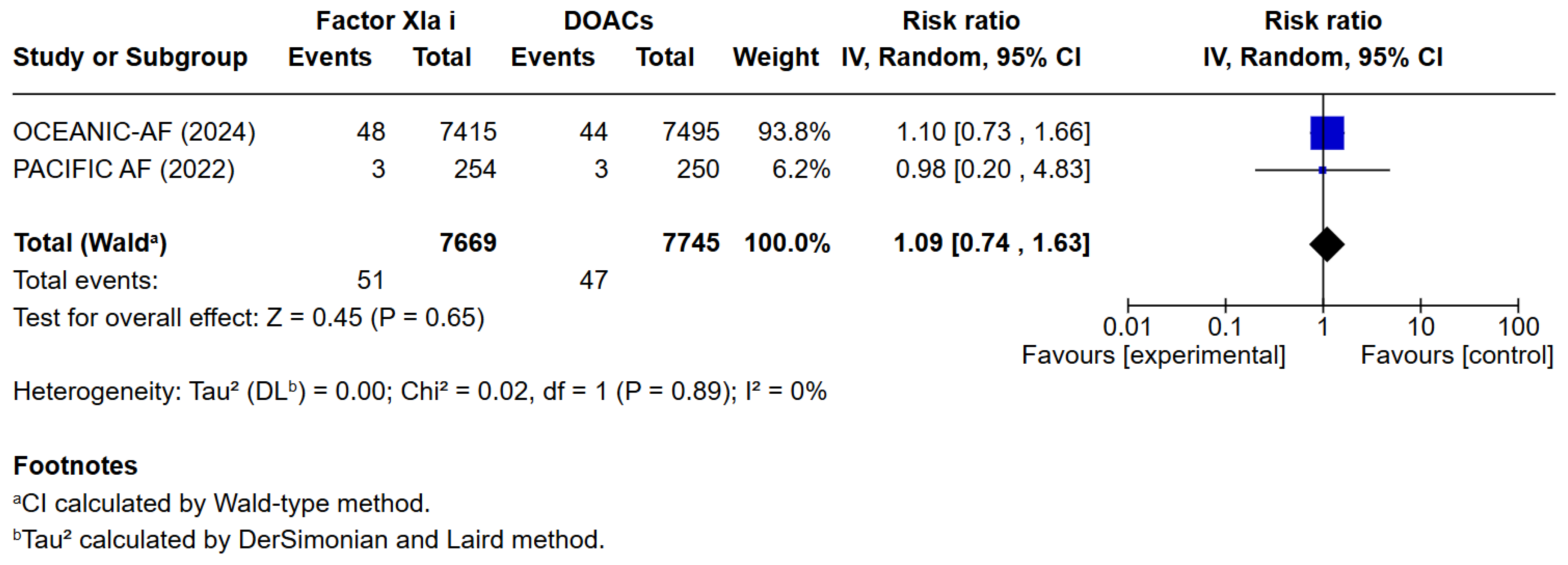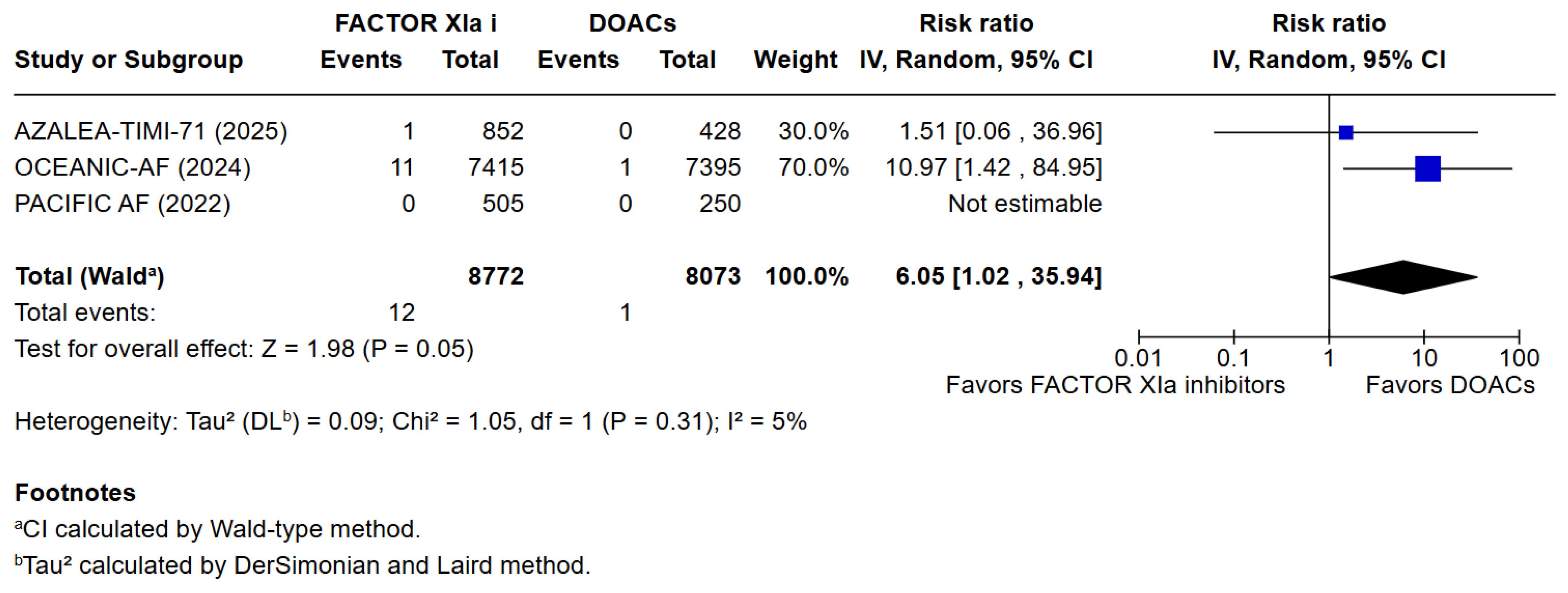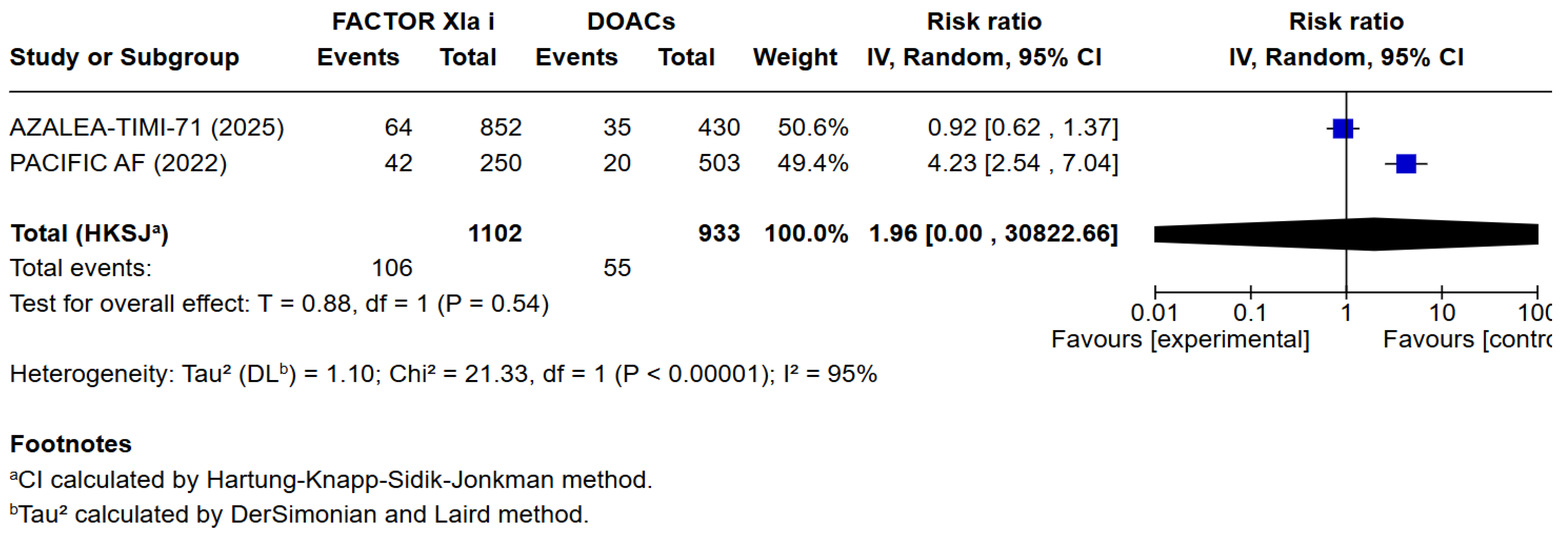 - Khater, J.; Occhipinti, G.; Cortese, B. Balancing safety and efficacy: Factor XIa inhibitors vs. DOACs in atrial fibrillation: S systematic review and meta-analysis of randomised controlled trials. Eur. Heart J. 2025, 46, ehaf784.522. [Google Scholar]
