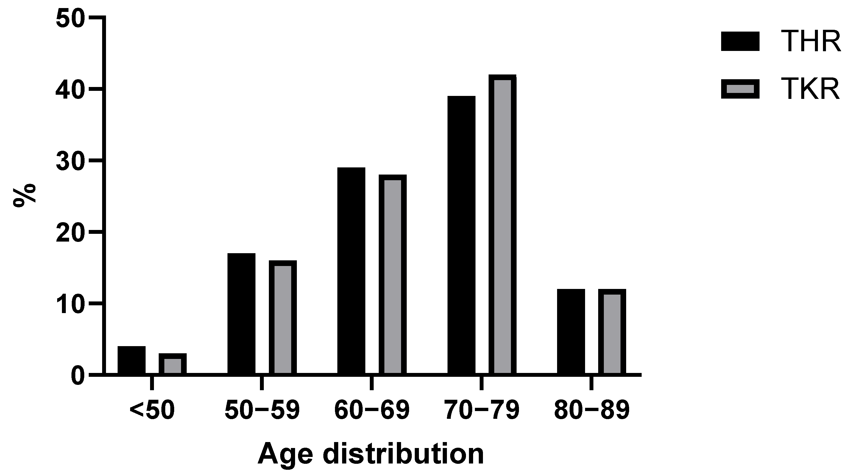 42]. Similar to other studies in the literature, the patients undergoing joint replacement in this study were elderly. The largest age group was 70–80 years. The THR group required significantly more erythrocyte transfusions (8%) in comparison with the TKR group (2%) (