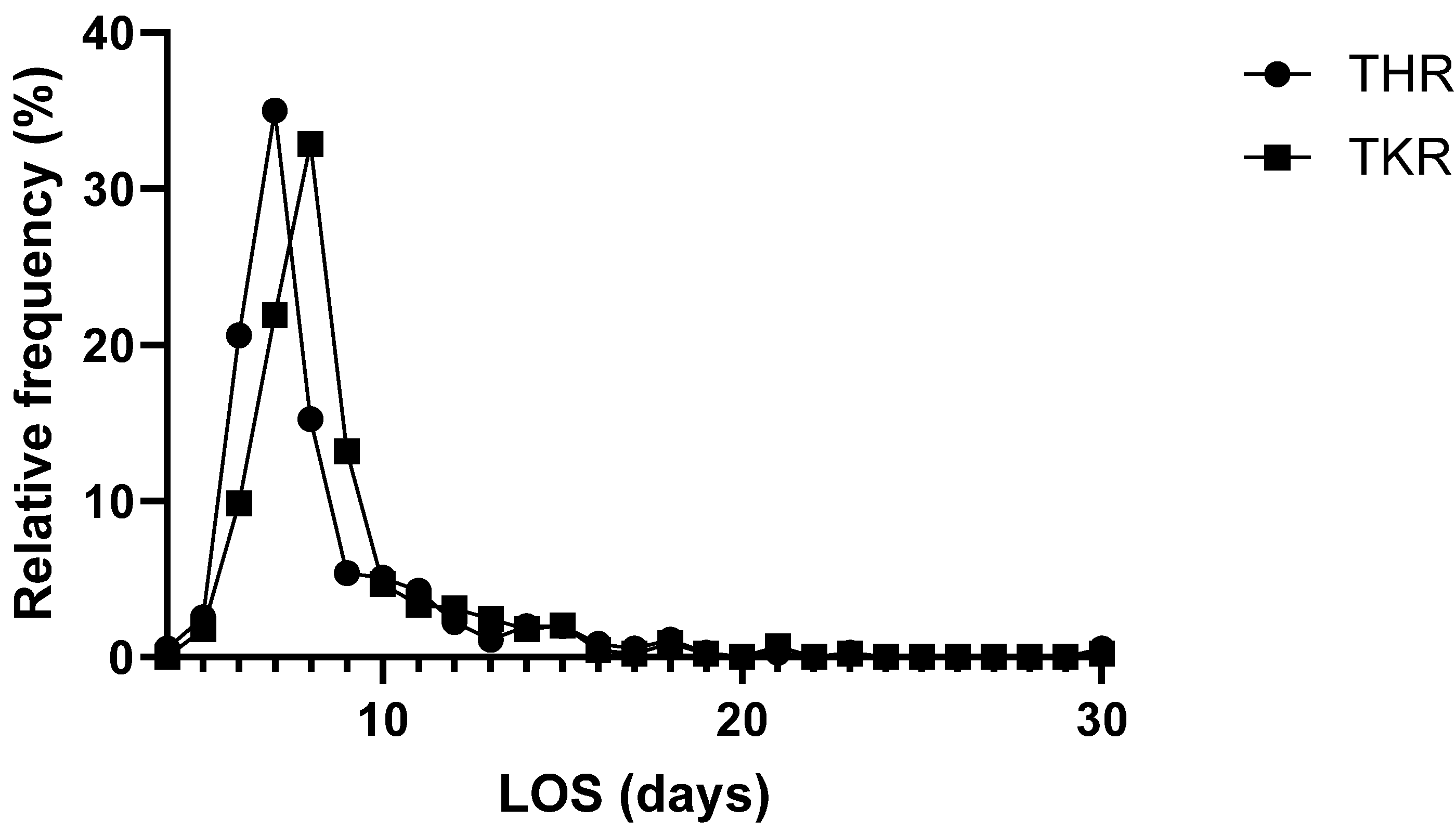 Figure 2). Three patients were admitted to the intensive care unit (ICU) after surgery; one of them (<1%) stayed for 2 days, one stayed for 4 days, and one stayed for 12 days. The length of stay (LOS) of patients receiving THR was 7 days (mean: 8; median: 7; Q1: 7; Q2: 9; IQR: 2; min: 4; max: 30); for TKR patients, the LOS was 8 days (mean: 9; median: 8; Q1: 7; Q2: 9; IQR: 2; min: 5; max: 30). The LOSs of the TKR and THR groups showed a normal distribution (both