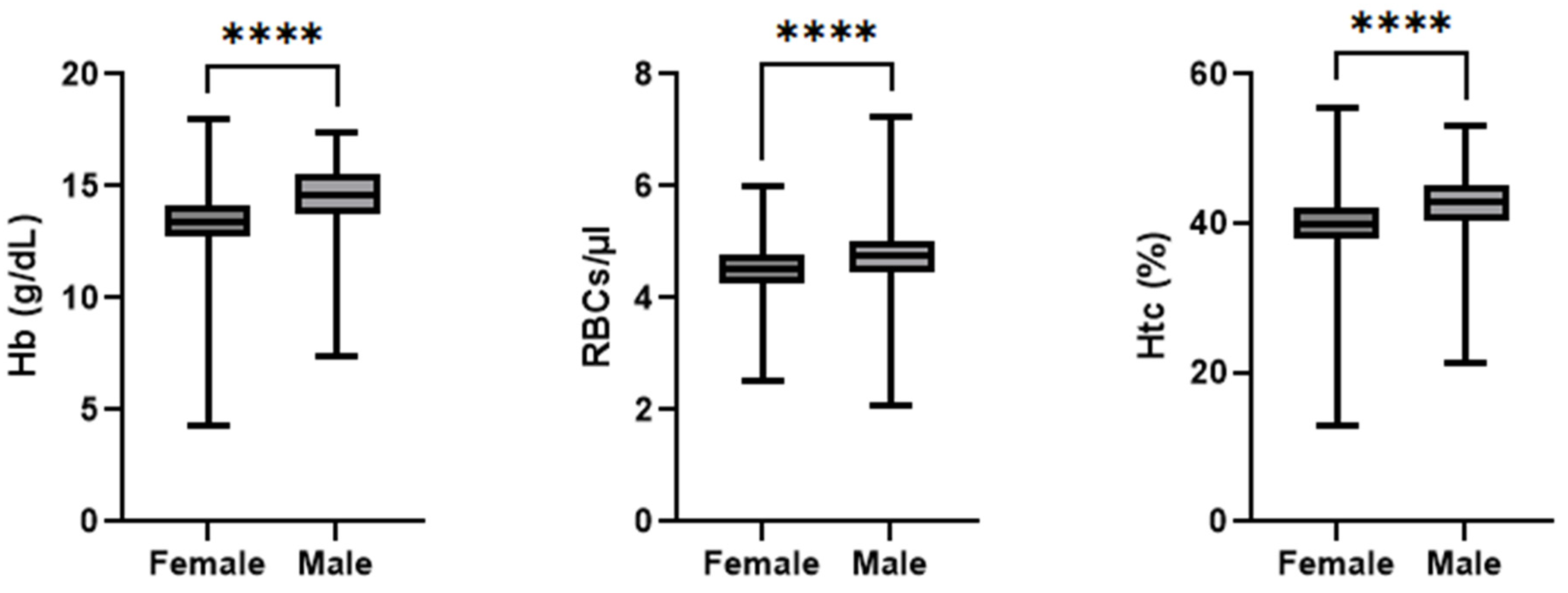 p < 0.001). Due to the gender-specific differences in hemoglobin standard values, all the hemoglobin-related data for the female and male patients are shown separately (
