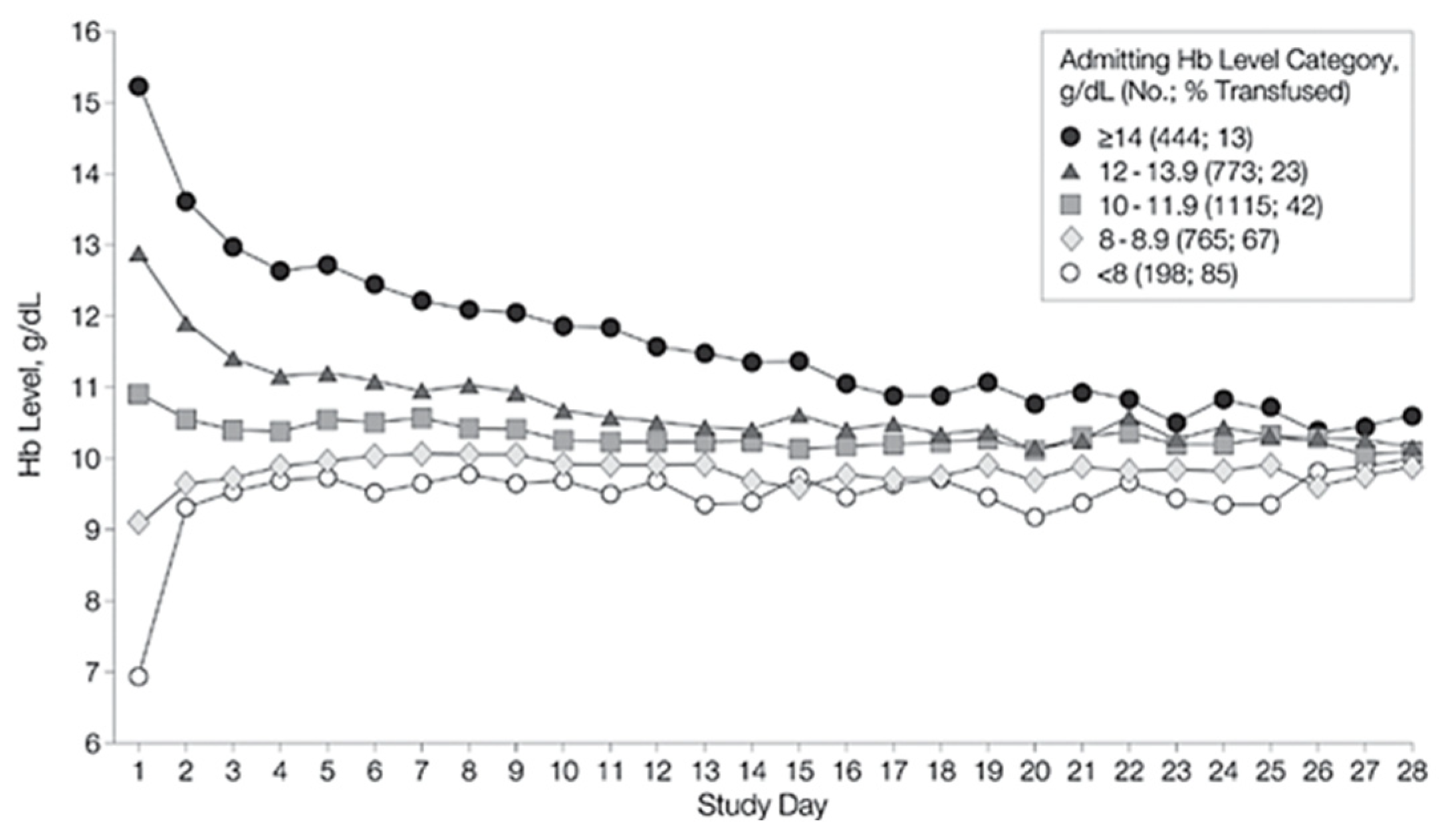 Of particular interest is the fact that the levels of the “8–8.9 g/dL” admitting Hb group started to rise as well. Considering the transfusion trigger of 8 g/dL, this should not have happened. Stimulated by these results, a similar but much simpler evaluation was performed in this study. A rise in hemoglobin level in the groups above the transfusion trigger was noticed as well. However, it should be noted that the increase was subtle and only affected a group consisting of a single patient. In their 2006 study published in