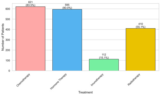 Chemotherapy 621 (83.5%) and hormone therapy 595 (80.0%) were the most frequently administered treatments, followed by radiotherapy 410 (55.1%) and immunotherapy 112 (15.1%), showing the predominant use of systemic therapies and limited adoption of immunotherapy (Figure 1).