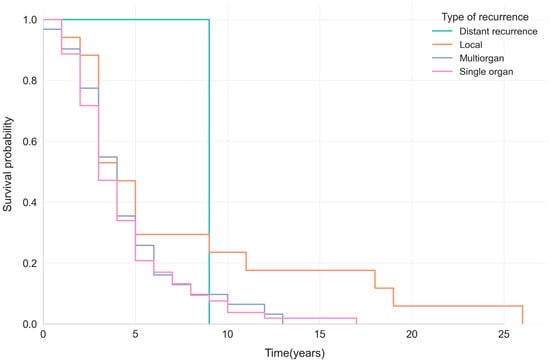 The Kaplan–Meier curves showed that survival after breast cancer recurrence is generally poor, with a median survival ranging from 3 to 4 years across recurrence types. Patients with local recurrence showed a slightly higher 5-year survival probability (~29%) than those with systemic (single- or multiorgan) recurrence (~20–26%) (Figure 3).