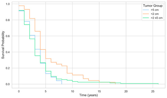 Kaplan–Meier survival curves by tumor size group among patients with breast cancer.