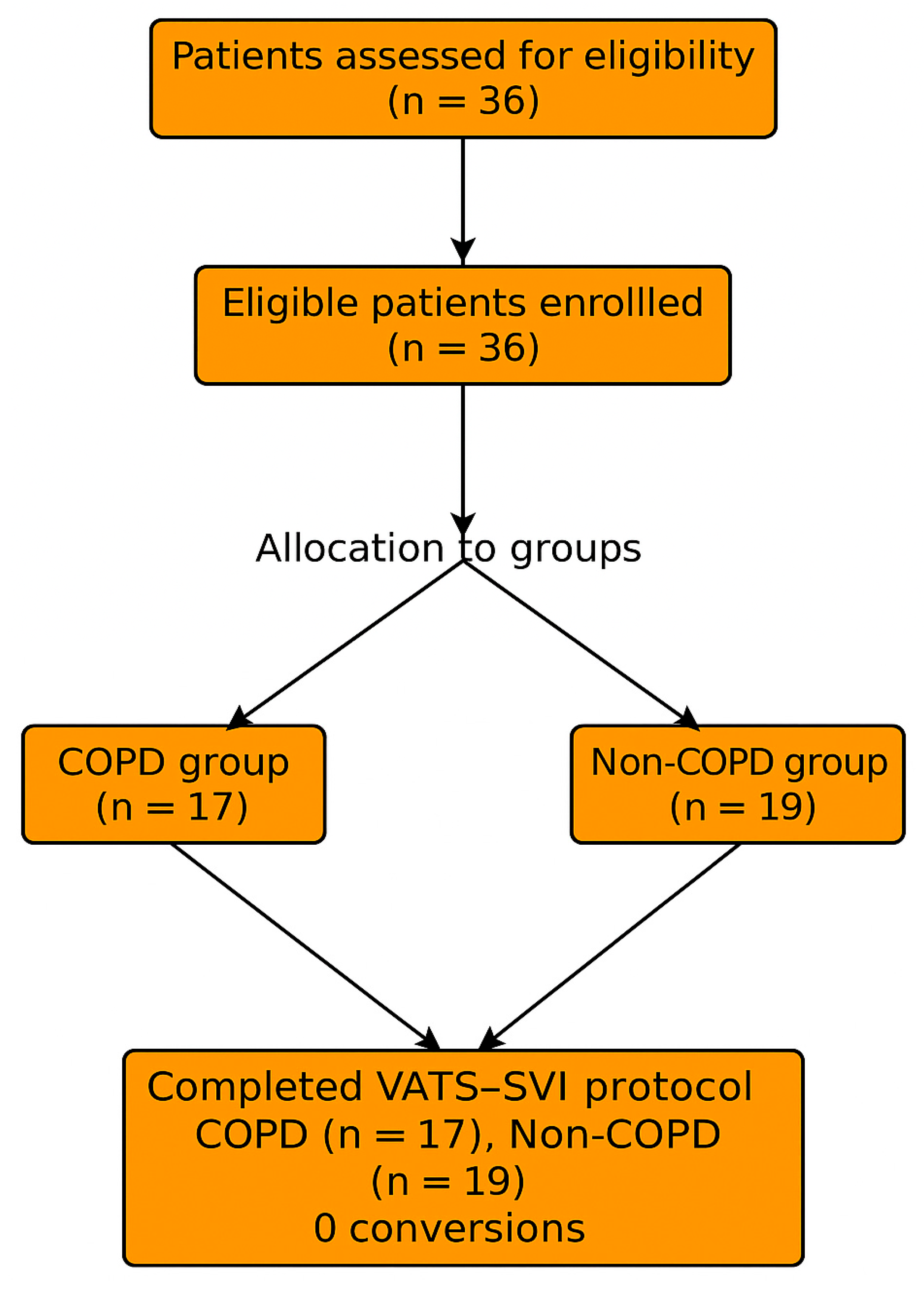 - Lung tumor ≤ 7 cm with N0 or N1 stage (ESTS criteria)