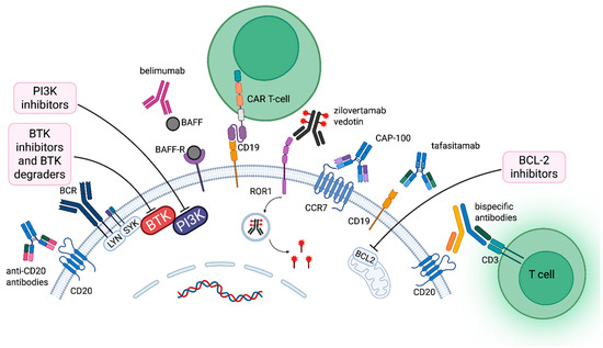 Therapeutic targets and emerging treatment strategies in chronic lymphocytic leukemia. Key membrane-bound proteins and signaling components targeted by novel therapies in CLL, including CD20, CD19, ROR1, BAFF-R, CCR7, BCR, BTK, PI3K, and BCL2. Therapeutic modalities include mAbs, BsAbs, ADCs, CAR-T cells, and small-molecule inhibitors. Abbreviations: ROR1 (Receptor tyrosine kinase-like orphan receptor 1), BAFF-R (B-cell activating factor receptor), CCR7 (C-C motif chemokine receptor 7), BCR (B-cell receptor), BTK (Bruton’s tyrosine kinase), PI3K (Phosphoinositide 3-kinase), BCL2 (B-cell lymphoma 2), mAbs (monoclonal antibodies), BsAbs (bispecific antibodies), ADCs (antibody–drug conjugates). Created in BioRender. Pula, A. (2025) https://BioRender.com/4cl4q8c (accessed on 24 October 2025).