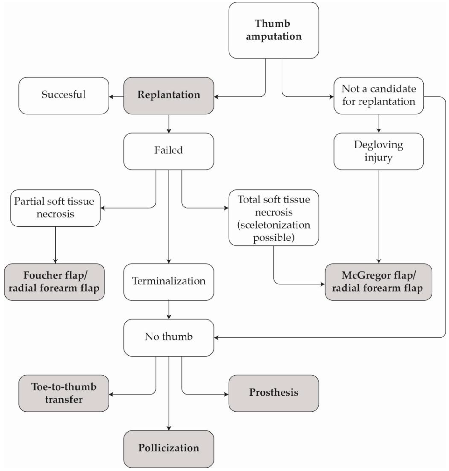 A structured approach tailored to the patient’s specific injury and functional goals is required for the management of thumb amputation. Although replantation remains the gold standard, various reconstructive and prosthetic solutions are available when this is not possible. Although our outcomes demonstrate a high success rate and significant potential for functional recovery, challenges such as joint stiffness and incomplete sensory recovery persist. Implementing our structured treatment algorithm has led to high success rates in thumb replantation and the efficient use of reconstructive alternatives. The algorithm enables us to provide personalized care based on clinical, anatomical and functional criteria, offering clear pathways even in complex cases. Our experience supports its continued use and broader adoption.