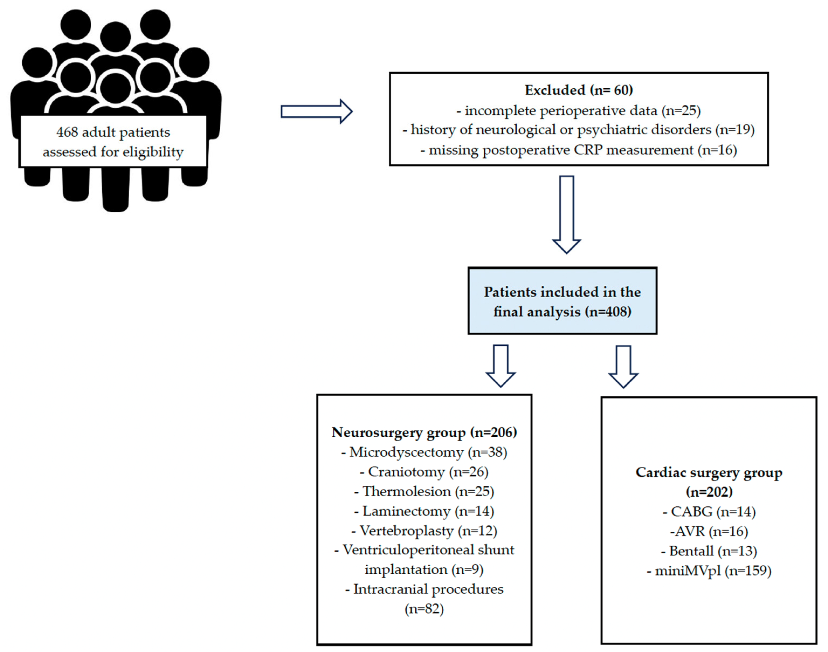 A total of 468 patients were initially screened. Sixty patients were excluded due to incomplete documentation, history of neurological or psychiatric disorders, or missing postoperative CRP measurements. The final study population consisted of 408 patients—202 cardiac surgery patients and 206 neurosurgical patients.