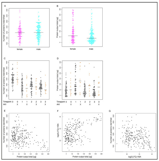 Protein coverage. Number of identified proteins and total protein output are displayed in relation to sex (A,B) perioperative timepoint/AKI status (AKI patients n = 13; non-AKI patients n = 54, bars represent median per group) (C,D) and Hemoglobin A abundance (F,G). Panel (E) depicts the relation of the number of identified proteins to total protein amount. Timepoints (0: Preoperative; 1 = direct after surgery; 2 = 6 h after surgery, 3 = 24 h after surgery); HBA = Hemoglobin A. AKI = Acute kidney injury.