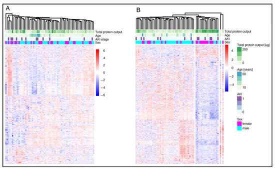 Cluster and proteome change upon surgery. Heatmap of relative protein abundance preoperative (A) and direct after surgery (B). AKI = Acute kidney injury. AKI patients n = 13; non-AKI patients n = 54. Proteins are z-scored the heatmap. Proteins and samples are clustered by hierarchical UPGMA clustering.