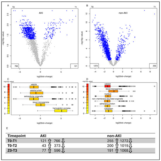 Changes in the proteome following surgery in patients with and without AKI. Relative changes in the urine proteome from T0 to T1 are displayed for AKI (n = 13) (A) and non-AKI (n = 54) (B) patients. Coloring cut-off = p < 0.05. The number of significant upregulated (↑) and downregulated proteins (↓) for each timepoint compared to timepoint 0 are stated in panel (E). Boxplot distributions of protein abundances from significantly enriched cellular components from a Gene Ontology (GO) term enrichment analysis for AKI (n = 13) (C) and non-AKI patients (n = 54) (D). Boxplot limits defined as center line: median, box limits: upper and lower quartiles, whiskers: most extreme data point which is no more than range times the interquartile range from the box, points: outliers. AKI = Acute kidney injury.
