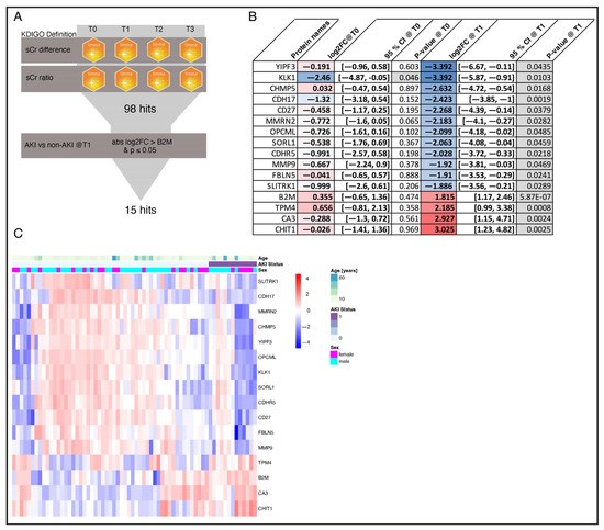 Protein selection. The applied protein selection process is illustrated in flowchart (A). The accordingly selected AKI candidate markers, including beta-2 microglobulin as a reference, are displayed with their relative abundance direct after surgery (T1) in heatmap (C) and ranked based on their log2 fold changes for AKI (n = 13) vs. non-AKI (n = 54) patients direct after surgery (T1) in (B). Red colored = elevated in AKI patients; blue colored = reduced in AKI patients. Proteins are z-scored in the heatmap. Proteins and samples within AKI status groups are clustered by hierarchical UPGMA clustering. AKI = Acute kidney injury; KDIGO = Kidney Disease: Improving Global Outcomes; sCr = Serum creatinine; log2FC = Log base 2 fold change; YIPF3 = Protein YIPF3; KLK1 = Kallikrein-1; CHMP5 = Charged multivesicular body protein 5; CDH17 = Cadherin-17; CD27 = CD27 antigen; MMRN2 = Multimerin-2; OPCML = Opioid-binding protein; SORL1 = Sortilin-related receptor; CDHR5 = Cadherin-related family member 5; MMP9 = Matrix metalloproteinase-9; FBLN5 = Fibulin-5; SLITRK1 = SLIT and NTRK-like protein 1; B2M = Beta-2 microglobulin; TPM4 = Tropomyosin alpha-4 chain; CA3 = Carbonic anhydrase 3; CHIT1 = Chitotriosidase-1. CI = Confidence interval.