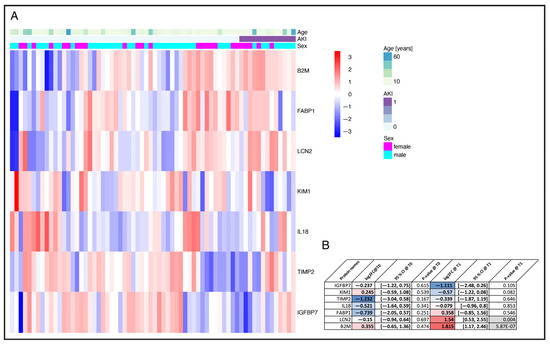 AKI reference marker. Relative abundance of the identified known AKI marker direct after surgery (T1) (A). Proteins are z-scored in the heatmap. Proteins and samples within AKI status groups are clustered by hierarchical UPGMA clustering. In panel (B) log2 fold changes preoperatively (T0) and direct after surgery (T1) are displayed with respective p-values for the identified AKI marker. Red colored = elevated in AKI patients; blue colored = reduced in AKI patients AKI = Acute kidney injury; B2M = Beta-2 Mikroglobulin; FABP1 = Liver type Fatty acid-binding protein; LCN2 = NGAL, Neutrophil gelatinase-associated lipocalin; KIM1 = Kidney injury molecule 1; IL 1 = Interleukin 18; TIMP2 = Tissue inhibitor of metalloproteinase 2; IGFBP7 = Insulin-like growth factor-binding protein 7; log2FC = Log base 2 fold change. AKI patients n = 13; non-AKI patients n = 54. CI = Confidence interval.