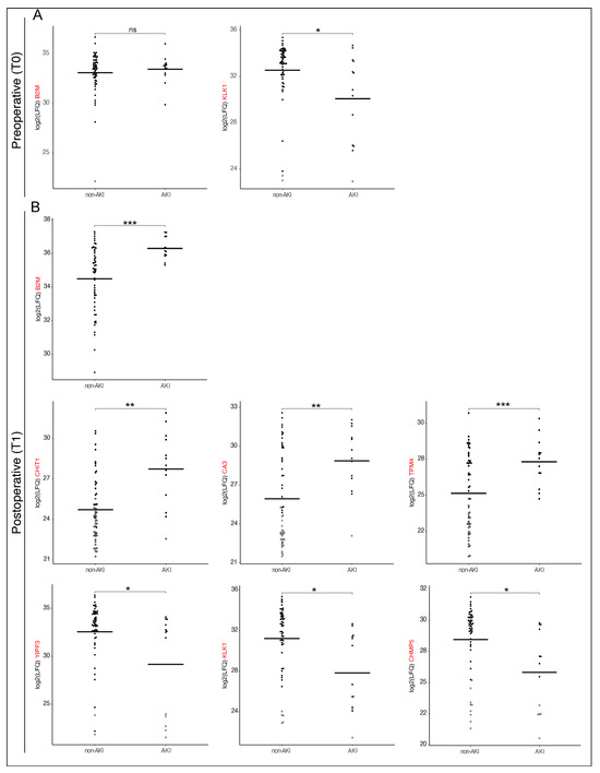 Dynamic Shifts in Biomarker abundance: Preoperative vs. Postoperative Differences in AKI and non-AKI patients. Different preoperative (A) and postoperative (B) log2 fold changes in biomarker abundance between AKI (n = 13) and non-AKI (n = 54) (B) patients are shown; bars representing median per group. Filled circles represent measured values; hollow circles indicate imputed values, and horizontal lines denote mean values. Statistical significance is indicated as follows * < 0.05, ** < 0.01, *** < 0.001 nominal p-value. Log2FC = Log base 2-fold change; B2M = Beta-2 microglobulin; KLK1 = Kallikrein-1; CHIT1 = Chitotriosidase-1; CA3 = Carbonic anhydrase 3; TPM4 = Tropomyosin alpha-4 chain; YIPF3 = Protein YIPF3; CHMP5 = Charged multivesicular body protein 5.