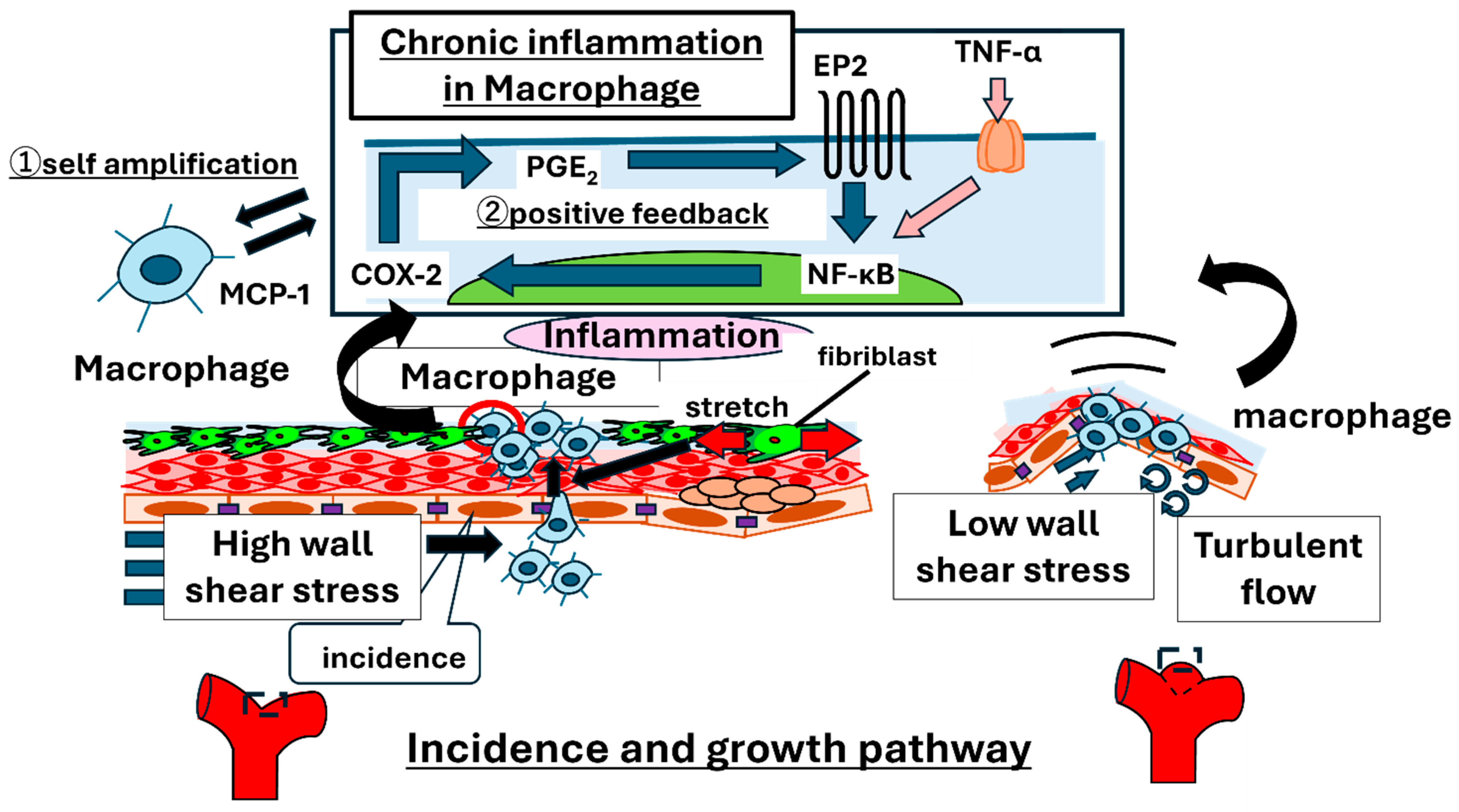 - Wei, H.; Wang, G.; Tian, Q. Low Shear Stress Induces Macrophage Infiltration and Aggravates Aneurysm Wall Inflammation Via Ccl7/Ccr1/Tak1/ Nf-Kappab Axis. Cell Signal 2024, 117, 111122. [Google Scholar] [CrossRef]