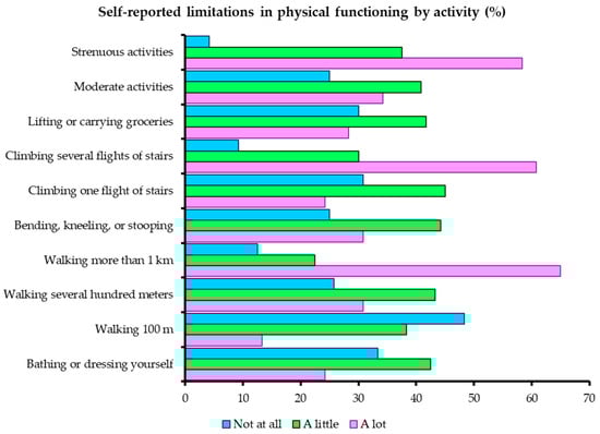 Limitations were most frequently reported for walking more than 1 km (65%), climbing several flights of stairs (60.8%), and performing strenuous activities (58.3%), while bathing, dressing, and short-distance walking were largely preserved (Figure 1).