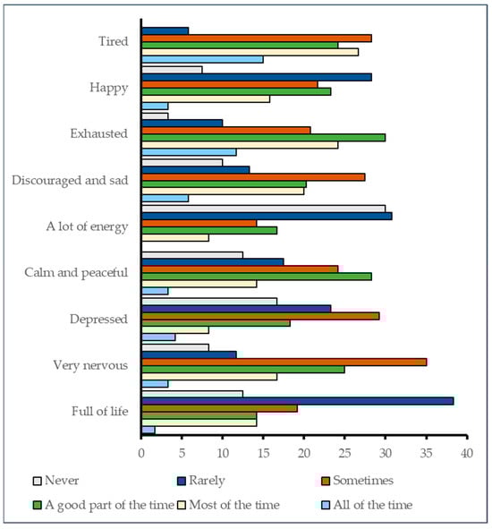 Participants frequently reported reduced vitality and psychological strain. As shown in Figure 2, 38.3% rarely felt full of life, 30.8% rarely had energy, and 30% stated they never had energy. Negative emotions were common: 35% felt very nervous, 29.2% sometimes depressed, and 27.5% discouraged or sad.