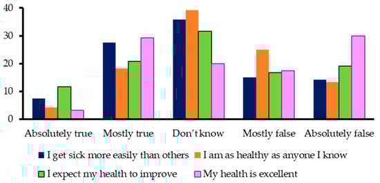 The GH domain reflected widespread pessimism. In response to the statement “My health is excellent”, 30% of participants answered absolutely false and 17.5% mostly false, meaning nearly half of the sample perceived their health as poor (Figure 3).