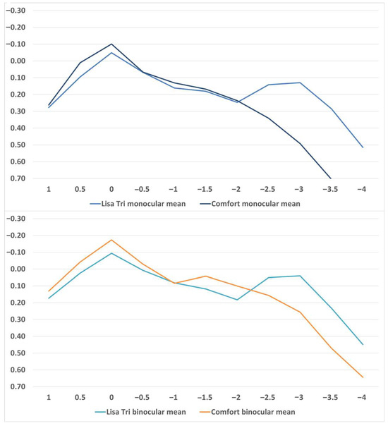 The monocular and binocular mean defocus curves for both IOLs are displayed in Figure 1. Numerical values can be found in Table 5. There were no significant differences for +1.0 D and +0.5 D, and for −0.5 D, −1.0 D, −1.5 D, and −2.0 D. There was a significant difference for 0 D, −2.5 D, −3.0 D, −3.50 D, and −4.0 D.