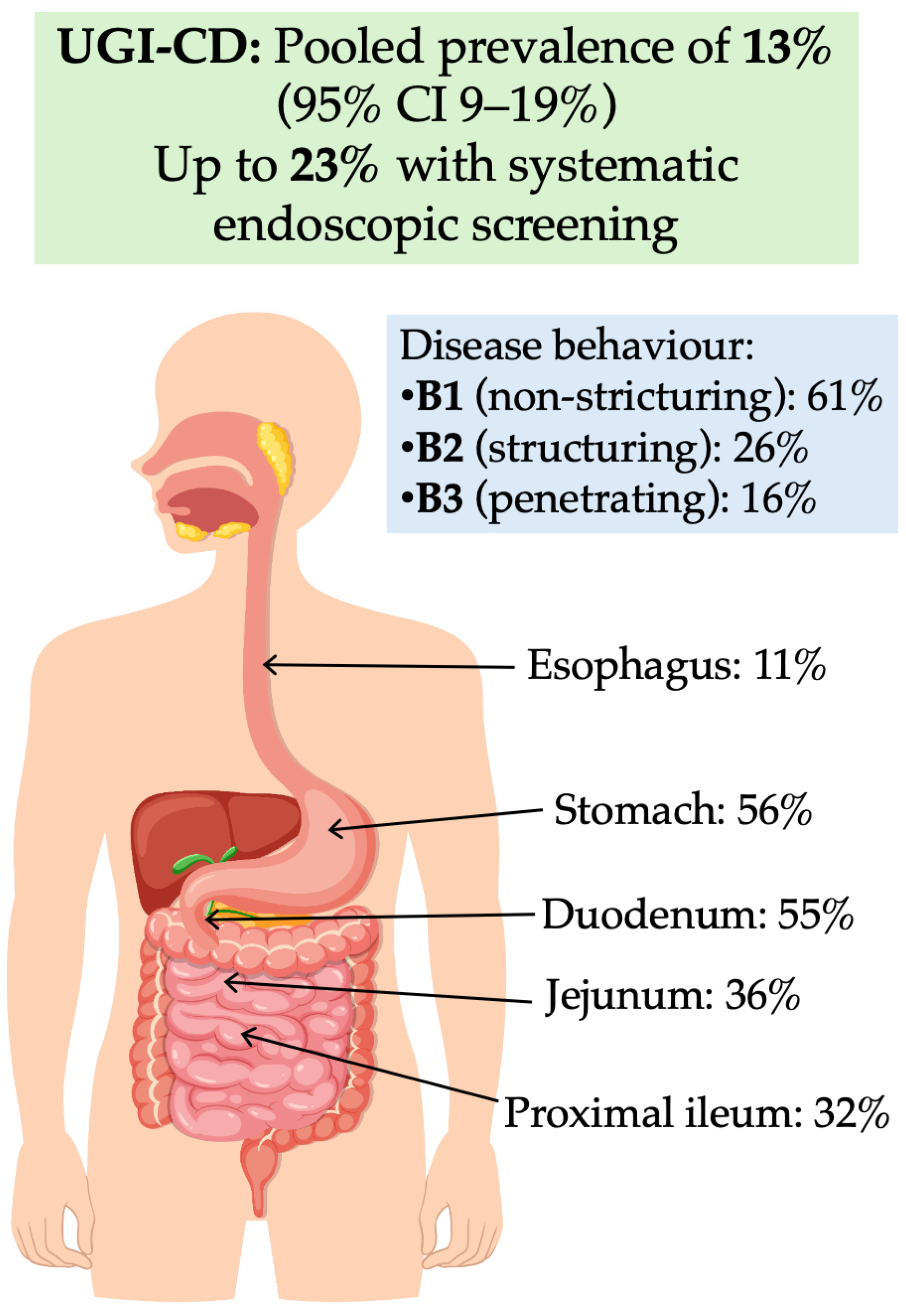 - Cohen, N.A.; Sror, N.; Naseer, M.; Bettenworth, D.; Lu, C.; Khedraki, R.; Abreu, M.; Atreya, R.; Al-Bawardy, B.; Connor, S.J.; et al. Diagnosis and Management of Upper Gastrointestinal Involvement in Adult Patients with Crohn’s Disease: A Systematic Review. Clin. Gastroenterol. Hepatol. 2025, in press. [Google Scholar] [CrossRef] [PubMed]