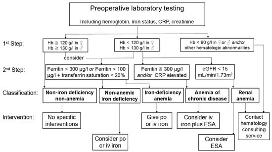 Diagnosis of anemia is simple. However, the complex and multifactorial biology of anemia (Table 1) requires extended laboratory testing and expert knowledge to initiate adequate therapy. Varying screening algorithms have been described to differentiate between the different types of anemia [15,31]. Generally, it is recommended to perform a full blood count including reticulocyte count, ferritin levels, transferrin concentration, transferrin saturation, and levels of soluble transferrin receptors (Table 2) [15]. The hemoglobin content of the reticulocytes (CHr) might have additional diagnostic value, as it specifies iron availability for erythropoiesis during the last 5 days. Further, C-reactive protein (CRP) and creatinine levels should be evaluated in anemic patients for more comprehensive therapeutic decision-making. Some laboratories offer the possibility to test for erythropoietin levels. However, absolute erythropoietin levels are often difficult to interpret and are of limited value, especially in patients with anemia of chronic disease [15,34]. Finally, more elaborate laboratory tests might be necessary in patients with specific hematologic diseases (e.g., myelodysplastic syndromes) or inborn hemoglobinopathies. In such patients, advice from hematologists seems imperative to optimize preoperative therapy [15].