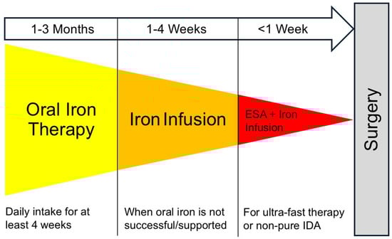 When surgery is scheduled within 2 weeks, oral supplementation is often unsuccessful. In such cases or when gastroenteric absorption might be impaired, intravenous iron administration has been suggested. Finally, functional iron deficiency is more difficult to treat than pure iron-deficiency anemia. It has been suggested to primarily treat the underlying disease, if possible. For an effective increase in the RBC mass, the combination of intravenous iron and erythropoiesis-stimulation agents (ESA) is commonly advocated in patients with anemia of chronic disease or non-pure iron deficiency [31] (Figure 3).