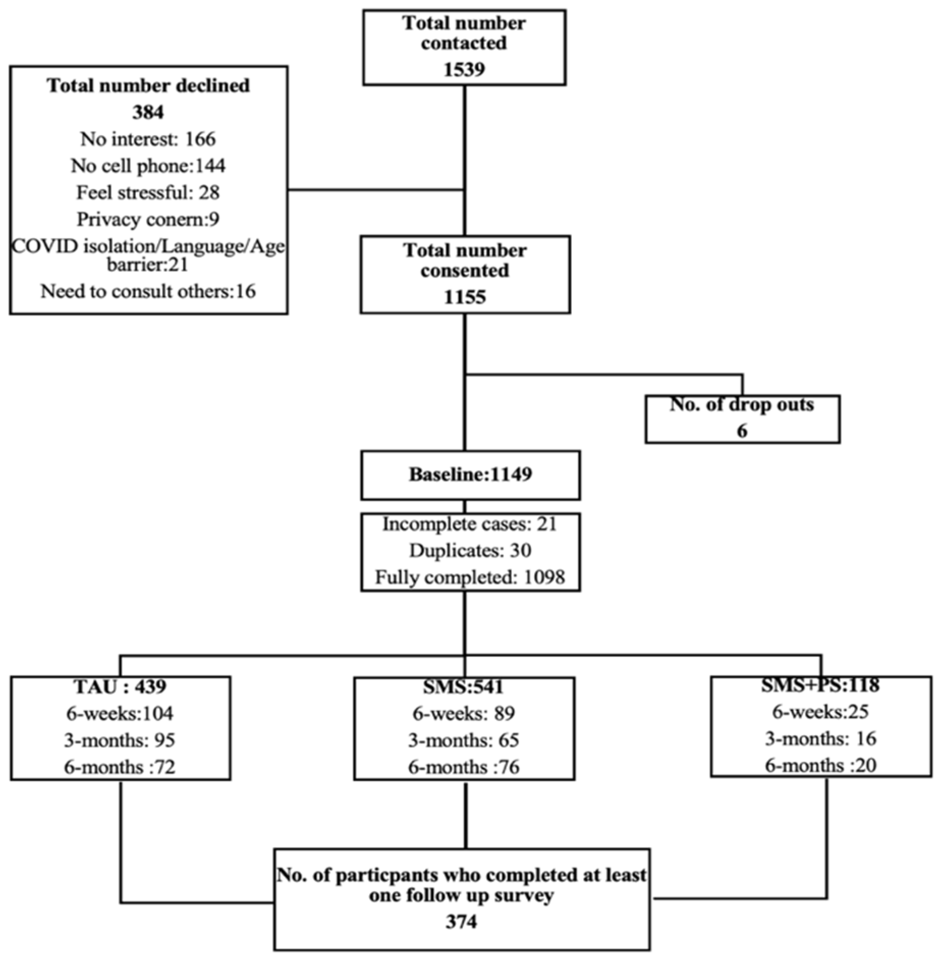 | TAU (n = 439) n (%) = 40.0% | SMS (n = 541) n (%) = 49.3% | SMS+PS (n = 118) n (%) = 10.7% | Total (n = 1098) | |