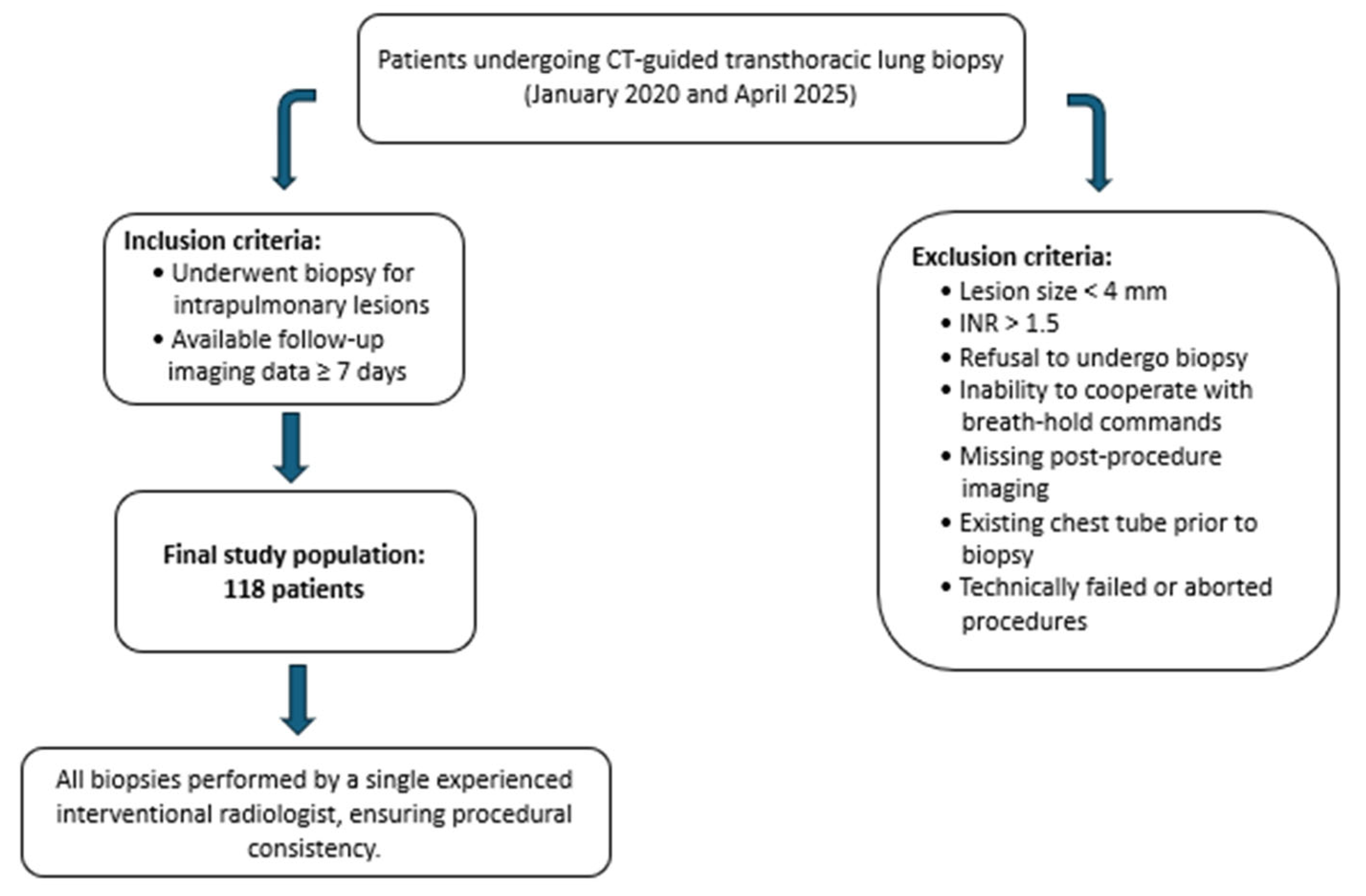 Patients were recalled from the institutional radiology database by procedural codes for CT-guided biopsies. The inclusion criteria considered an intrapulmonary lesion that was a candidate for CT-guided biopsy and imaging after the procedure within 7 days. Exclusion criteria included lesions <4 mm, INR > 1.5, prior chest tube placement, aborted or technically failed procedures, inability to follow breath-hold instructions, and absence of post-biopsy imaging. Lesions amenable to bronchoscopy or located in the pleura or mediastinum were not considered in this study.