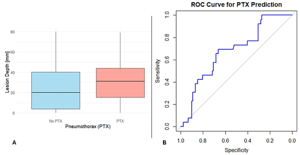 Figure 2A, patients who developed PTX had greater lesion depths compared to those who did not.