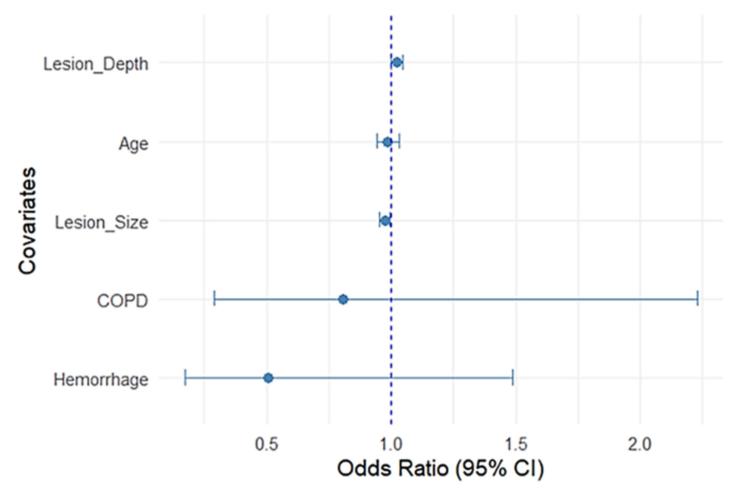 Hemorrhage, COPD, and age were not significant. Narrow confidence intervals for the lesion parameters reflect precise estimates compared with wider intervals seen with comorbidity variables, reflecting greater uncertainty.
