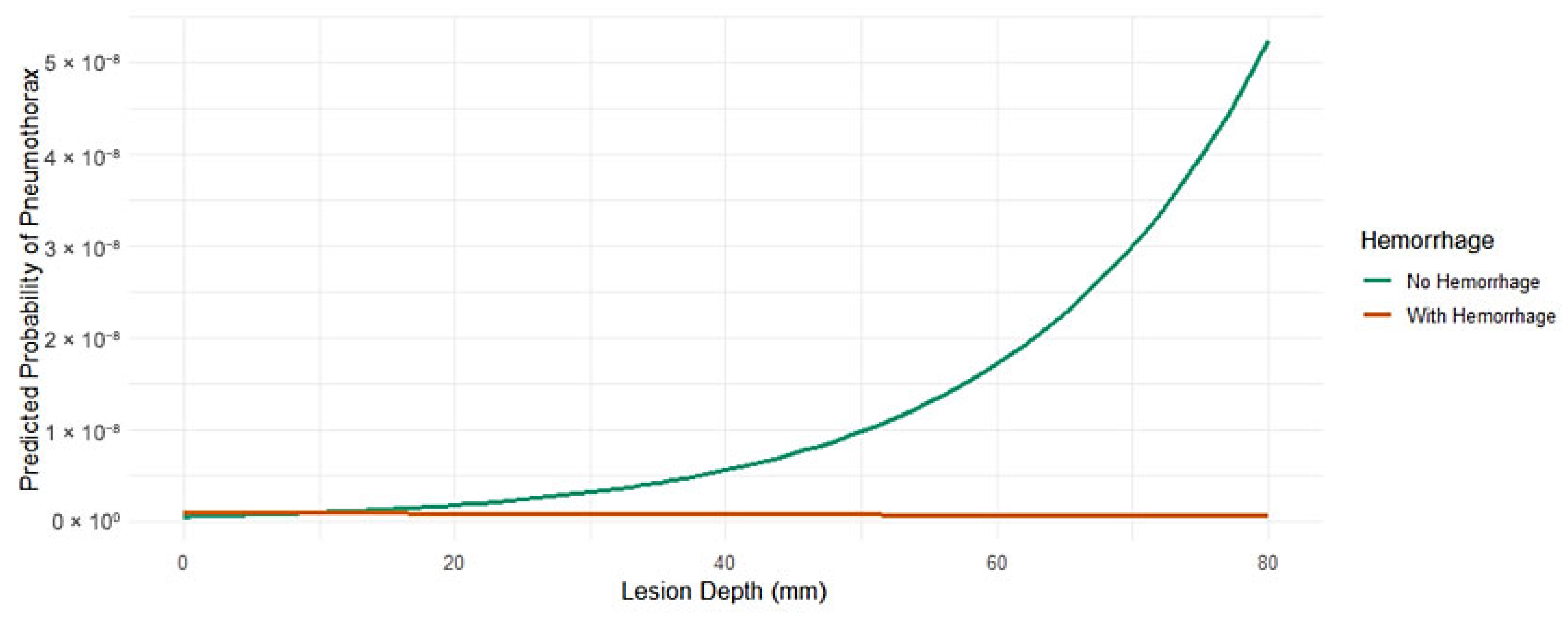 12]. The potential moderating effect of hemorrhage on the relationship between lesion depth and PTX risk provides additional nuance. This interaction was not statistically significant, but the continuous tendency implies that small tract bleeding may partially protect against PTX by closing alveolar defects [