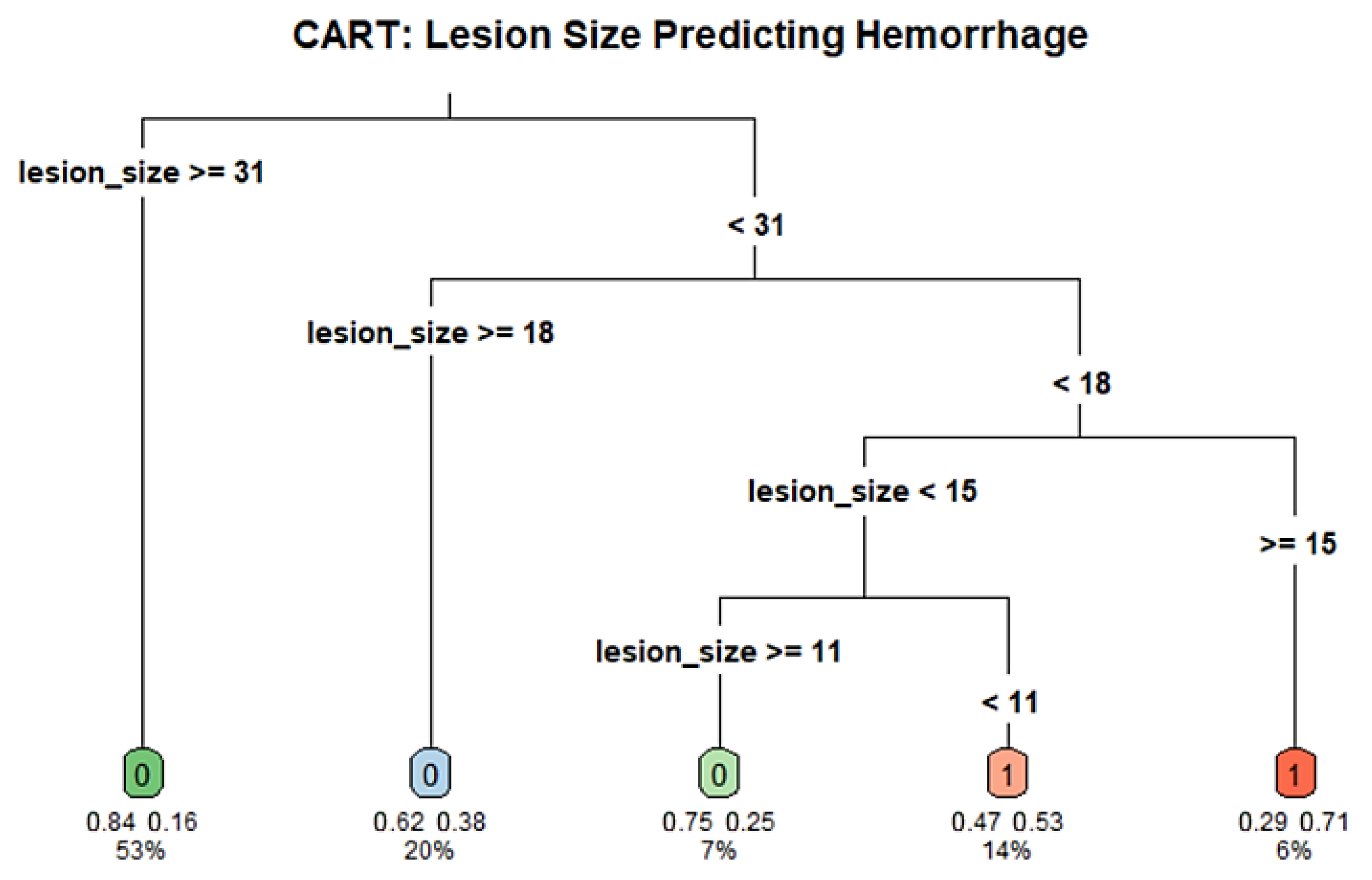 In a separate regression model evaluating predictors of hemorrhage, lesion size was the only variable that reached statistical significance. Specifically, larger lesions were less prone to hemorrhage (β = −0.039,