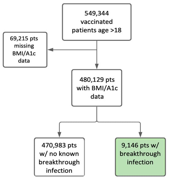 We used the VA’s Corporate Data Warehouse via the VA Informatics and Computing Infrastructure (VINCI). As there are several million patients in the database, we took a randomly sampled subset of about 60% of those patients in order to keep the remainder of patients for use in testing our models in the future. Among those, we identified nearly 549,344 patients older than age eighteen who were vaccinated between 1 December 2020 and 22 August 2021 without a positive COVID-19 test within six weeks of receiving their first vaccine. We included patients who developed breakthrough infections within six months of full vaccination. Among those, 480,129 patients had available BMI and HbA1c data; of these, all had data available for the covariates of race, ethnicity, sex, and age, and 467,283 had data available for district as well. We identified 9146 patients who had a breakthrough infection during the study period. We selected hemoglobin A1c as a marker of diabetes instead of a diagnosis of diabetes in order to be able to assess glycemic status as a continuous variable. We similarly chose BMI as a marker of overweight and obesity in order to assess weight status on a continuum. We sampled HbA1c and BMI measurements using the most recent value on record available up to January 2018, in particular to capture less frequent HbA1c measurements. BMI and A1c values are a single time point for the most recently available value. Using Cox proportional hazards and Kaplan–Meier curves, we compared the rate of breakthrough infection over time among patients of various HbA1c and BMI ranges. Using multivariable logistic regression, we assessed the role of BMI and HbA1c on the rate of hospitalization.