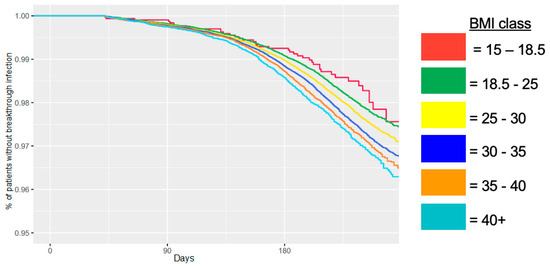 Using Cox proportional hazards modeling, we show that HbA1c is a greater hazard for breakthrough infection than BMI. The Cox tables show coefficients and p-values for Cox proportional hazards modeling for time from vaccination until breakthrough infection, adjusting for covariates, including race, ethnicity, sex, age, and district (Table 4). We used models that included BMI, HbA1c, both, or neither. We found that hazard ratios for breakthrough infection are impacted by BMI, HbA1c, and both. In the model that included BMI without HbA1c, the hazard ratio (HR) for risk of breakthrough infection was 1.017 (p < 0.001). In the model with HbA1c without BMI, the HR was 1.077 (p < 0.001). When both BMI and HbA1c were added to the model, the HRs were 1.015 (p < 0.001) and 1.063 (p < 0.001), respectively. Both covariates are highly significant; however, HbA1c portends a higher risk. In other words, a one-point increase in HbA1c correlates with a higher risk of breakthrough infection than adding one point to BMI. Using a Kaplan–Meier curve, we graphically show that patients with the highest BMI class had the highest rates of breakthrough infection at a given time after full vaccination (Figure 2). It is noteworthy that the y-axis is only 5%, in order to highlight the differences. The patients in the lowest BMI category appear to have a lower risk than patients within the normal weight category.