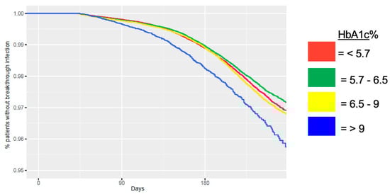 Using multivariable logistic regression, we then modeled the probability that someone would be hospitalized, with COVID-19 disease as the primary inpatient diagnosis, within thirty days of their breakthrough infection. Adjusting for the same variables as in the prior analysis, among patients with breakthrough COVID-19 infections, a one-point increase in BMI or HbA1c portends a statistically significant increase in the odds of hospitalization with a primary diagnosis of COVID-19. The odds ratio (OR) for risk of hospitalization from a breakthrough infection in the model with BMI, without HbA1c, was 1.017 (p = 0.001). The OR for the risk in the model with HbA1c, without BMI, is 1.158 (p < 0.001). When both BMI and HbA1c were added to the model, the HR were 1.010 (p = 0.053) and 1.063 (p < 0.001), respectively. In this case, a higher HbA1c again shows a higher risk of hospitalization than higher BMI (Table 5). Again, using a Kaplan–Meier curve, we show that patients with the highest HbA1c, which we delineated as >9%, have a disproportionately higher rate of breakthrough infection than patients with lower HbA1c (Figure 3).